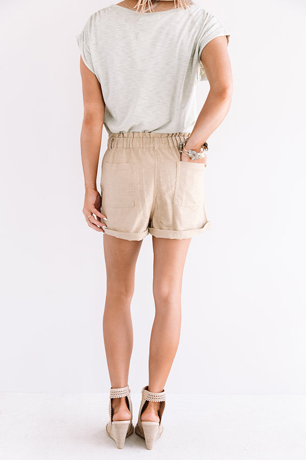 Make the world your runway in our adorable khaki colored "Scout" shorts featuring lightweight material, a high waistline with cinched detailing, four accent side and back pockets, belt loops, a four button closure, and a relaxed silhouette that falls into straight cuffed upper-thigh length hemlines! We have styled these cuties with a basic tee and matching wedges, but you can also wear it with our "Kiss And Tell Bodysuit in Brown" layered under a denim jacket, our "Serving Up Chic Headband in Cream," "The Ellie Snake Print Sneaker in Birch," and our "Neutral Territory Snake Print Tote in Brown!" Measurements