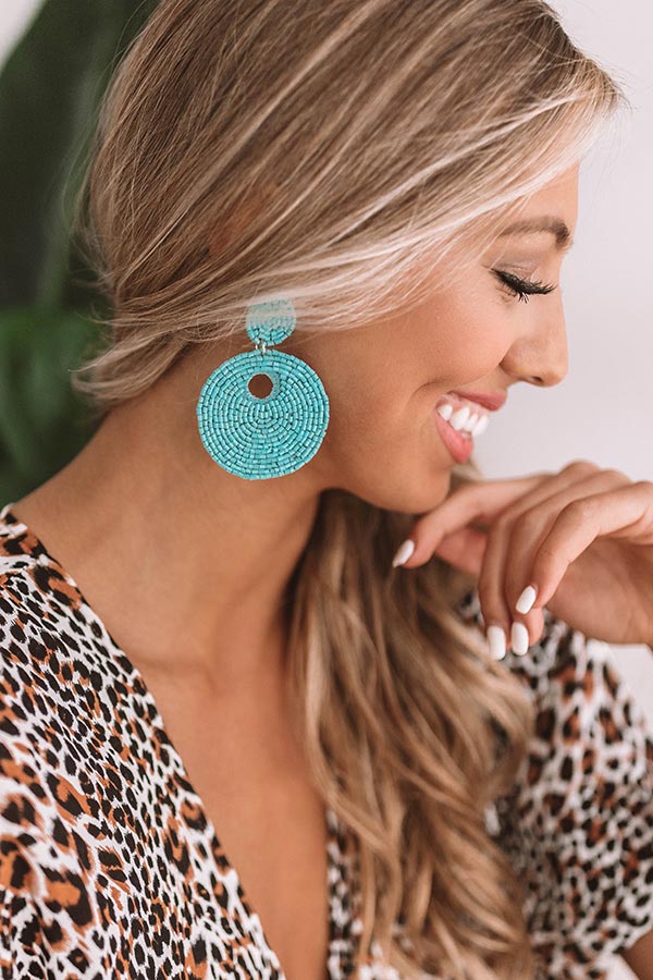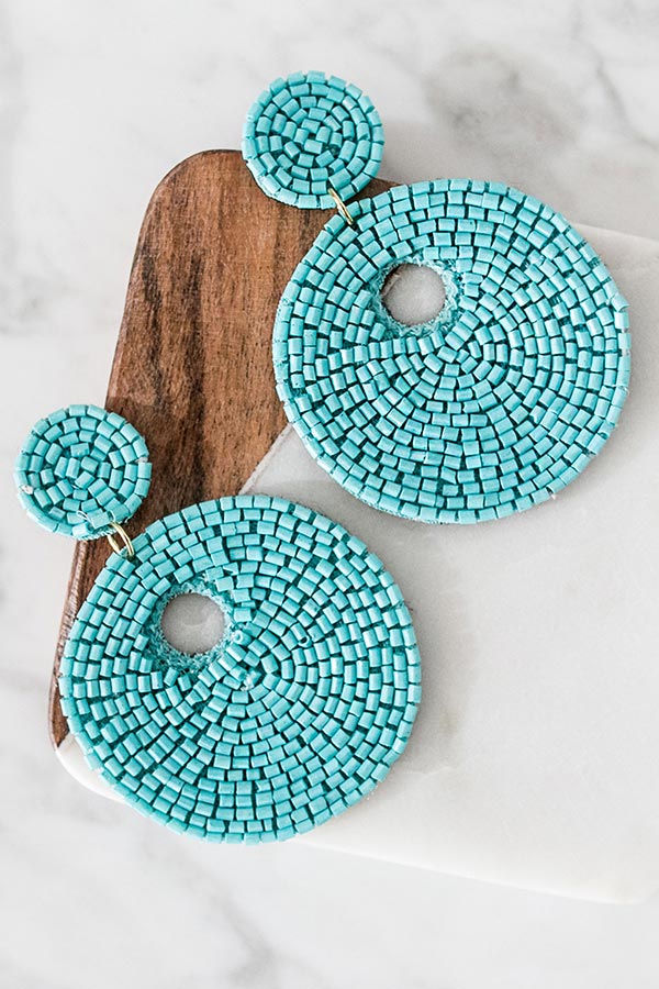 You are sure to look like a total beach babe when you accessorize with our adorable turquoise beaded "Serendipity" statement earrings feature circle studs and large pendants with an open center!