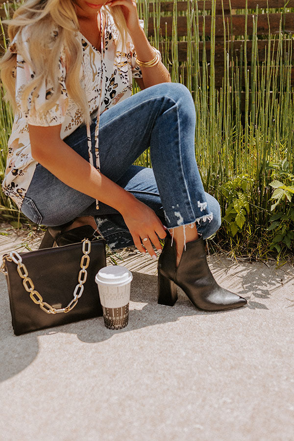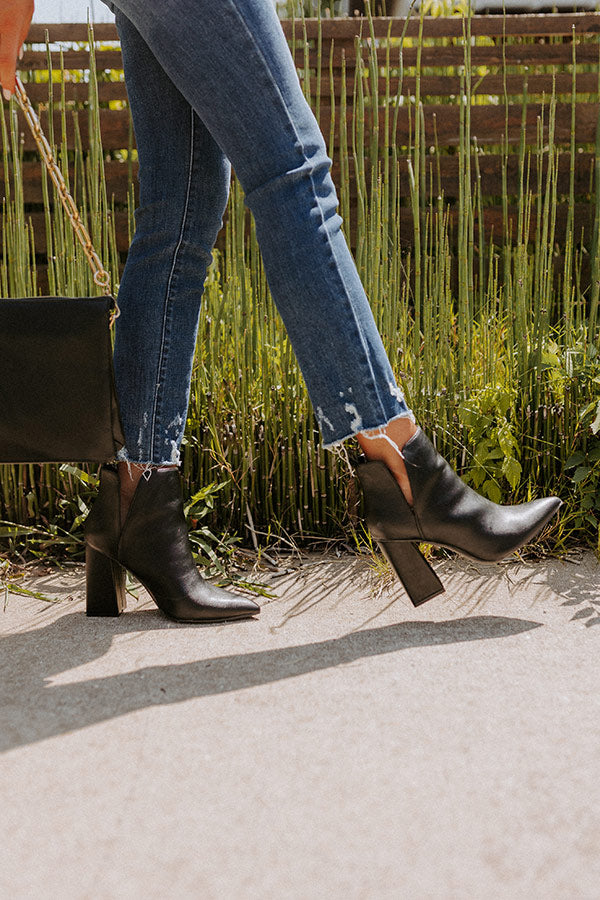 A fall transition essential, our cute black 'Sibyl' bootie featuring faux leather material, a pointed closed toe, a 4-inch block heel, accent notches on the inside and outside of the ankle, and a pull tab in the back! For a more comfortable fit, we recommend ordering a 1/2 size up from what you typically wear. For example, if you normally wear a size 7, we recommend ordering a size 7.5.
