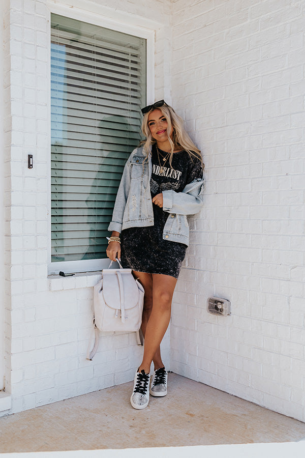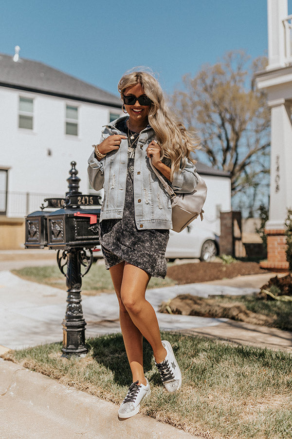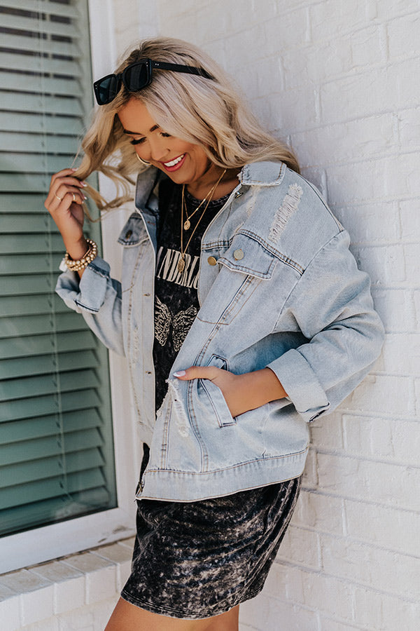 Your seasonal outfits will be envied when you complete your look with 'The Siobhan' denim jacket featuring lightweight light wash material with distressed detailing, a button down front with a collared neckline, two chest pockets with flap closures, long loose sleeves button closure cuffs that can be rolled, and a relaxed silhouette that falls into a straight hemline! Measurements