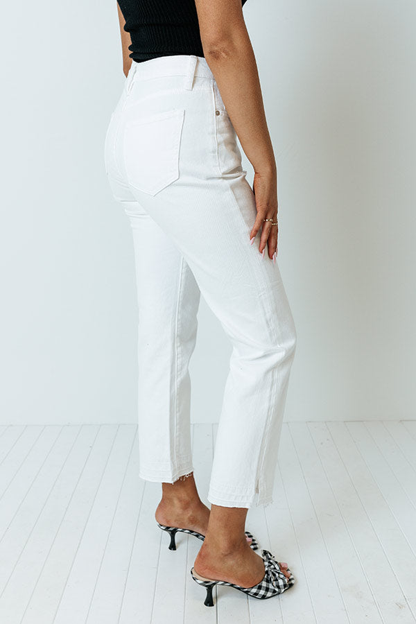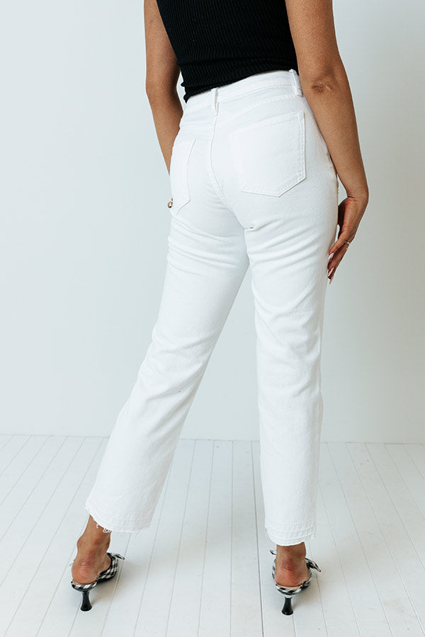 Keep your look timeless with our classic white 'Slater' jean featuring lightweight material, a high waistline with belt loops, a hidden zip fly with a button closure, a classic four-pocket cut, and a flattering figure hugging silhouette that ends in straight ankle-length hemlines!