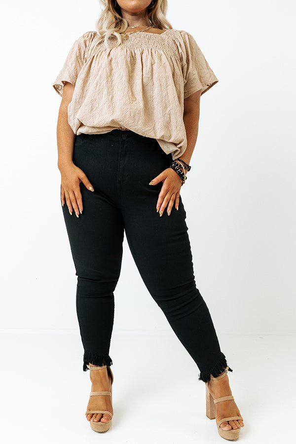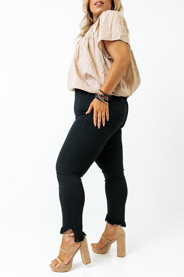Every girl needs the perfect pair of pants, and the black 'Sloane' skinnies are beyond perfect! They feature lightweight and stretchy denim material, a high waistline with belt loops, a classic five pocket cut, a hidden zip fly with a button closure, and a flattering form fitting silhouette that falls into frayed ankle-length hemlines!