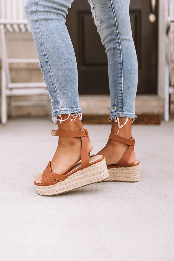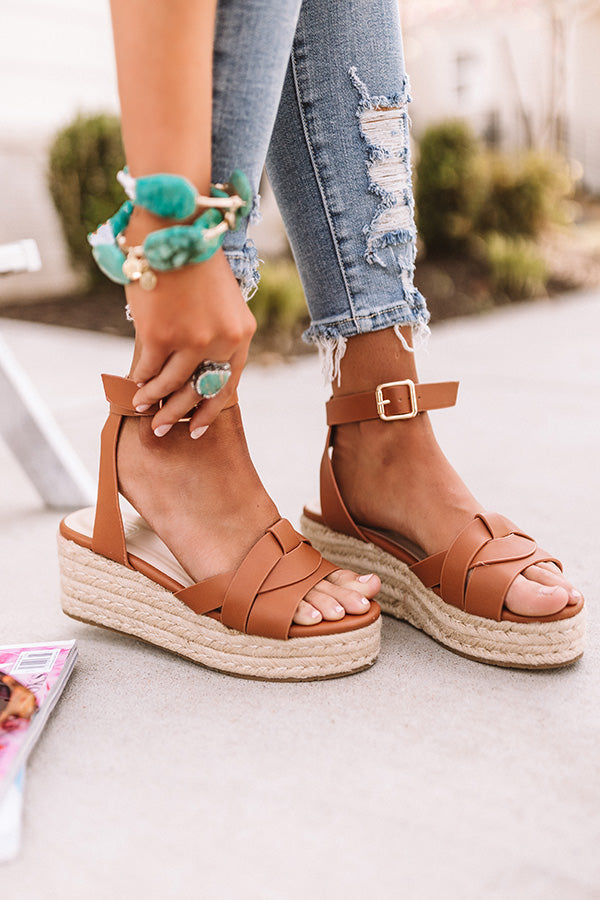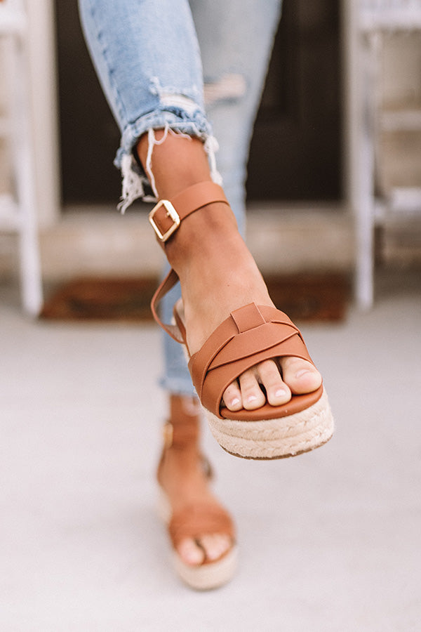 Stay neutral this summer with our brown faux leather "Sorrella Wedge" featuring three crossed over-the-foot straps, 3-inch platform soles with braided texturing, rounded open toes, and open heels with buckled ankle straps!