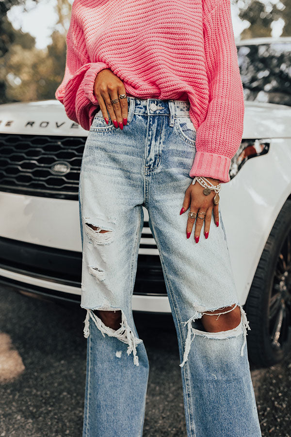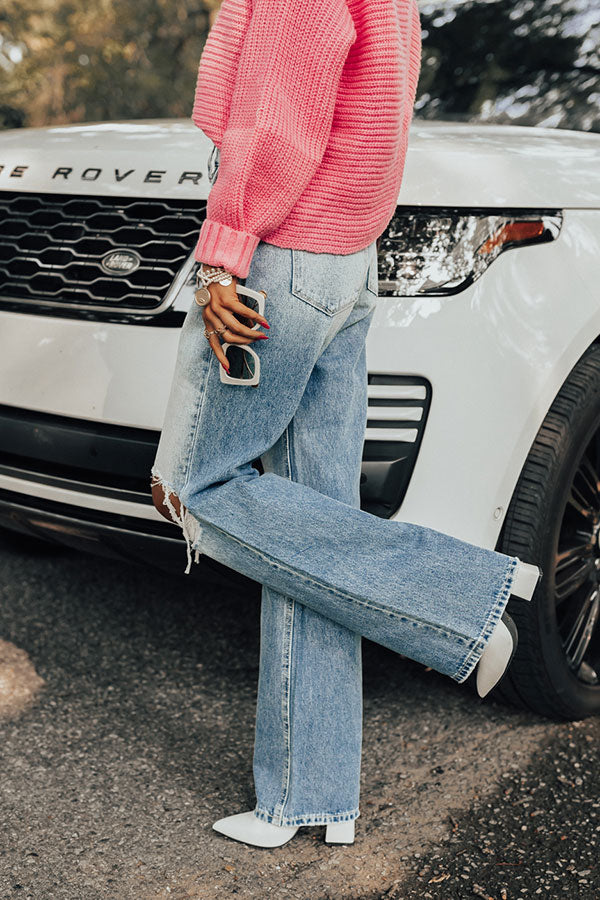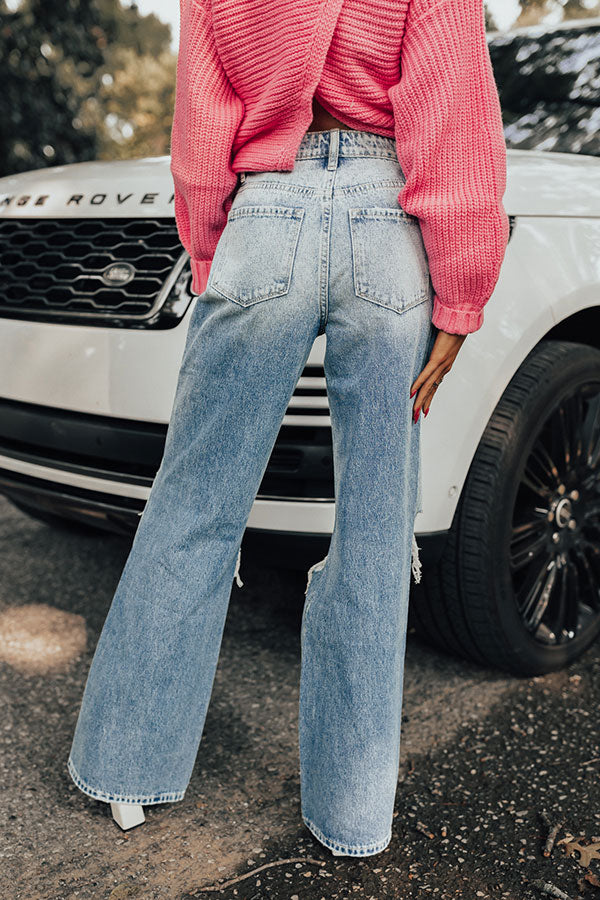 Our comfiest pair of jeans yet! The 'Spell' flare features light wash denim material with accent fading and distressed detailing, a high waistline with belt loops, a classic four-pocket cut, a hidden zip fly with a button closure, and a relaxed silhouette that ends in straight subtly flared ankle-length hemlines!