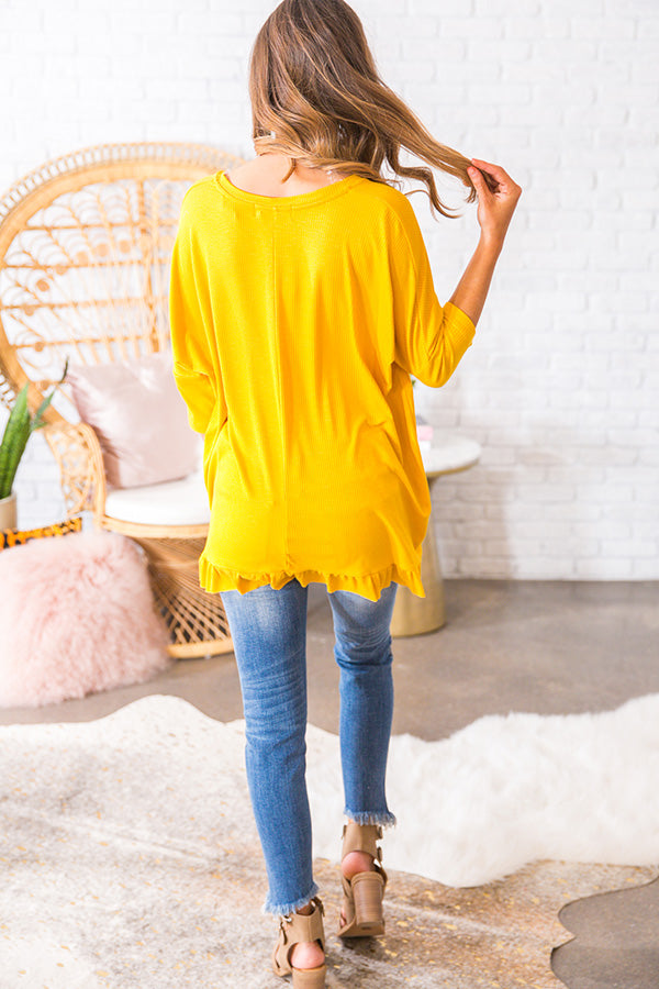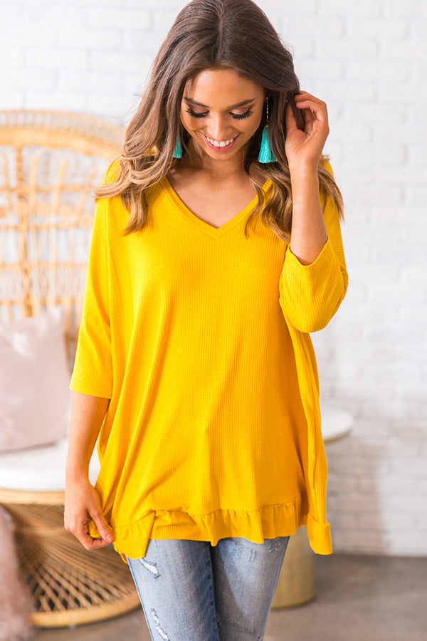 The "Standout Shift Tee" is sure to stand out amongst your other basic essentials! This relaxed ribbed tee has a v-neckline, short dolman sleeves & a breezy shift bodice with a ruffled bottom hem. Wear this tee solo, or layer it under any look... Your options are endless with this versatile closet staple!