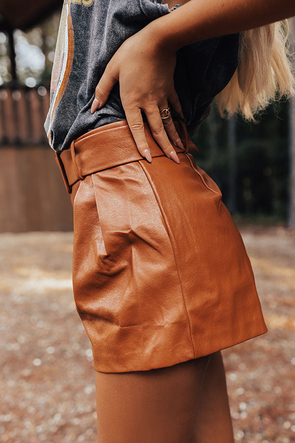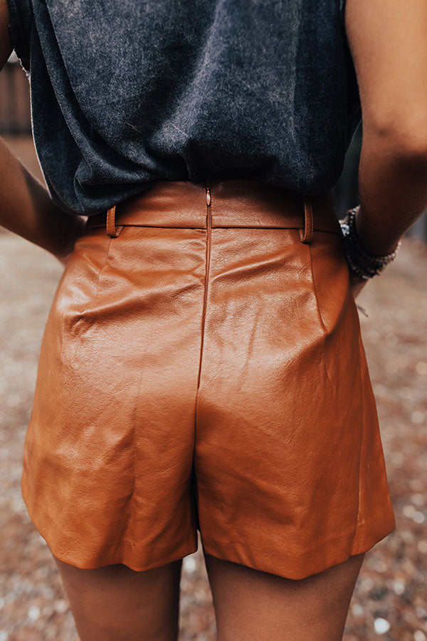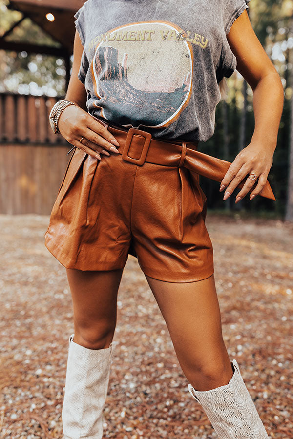 Transition into fall effortlessly with our chic rust colored 'Stanley' shorts featuring sleek faux leather material, a belted high waistline with pleated detailing, and a relaxed but flattering sihouette that ends in straight upper-thigh length hemlines! Measurements
