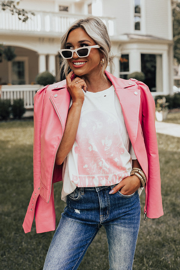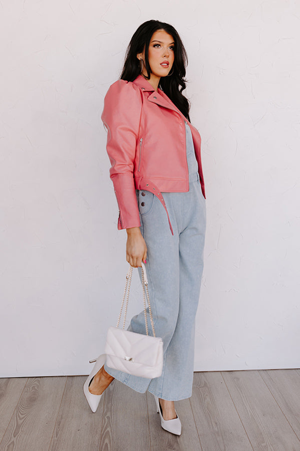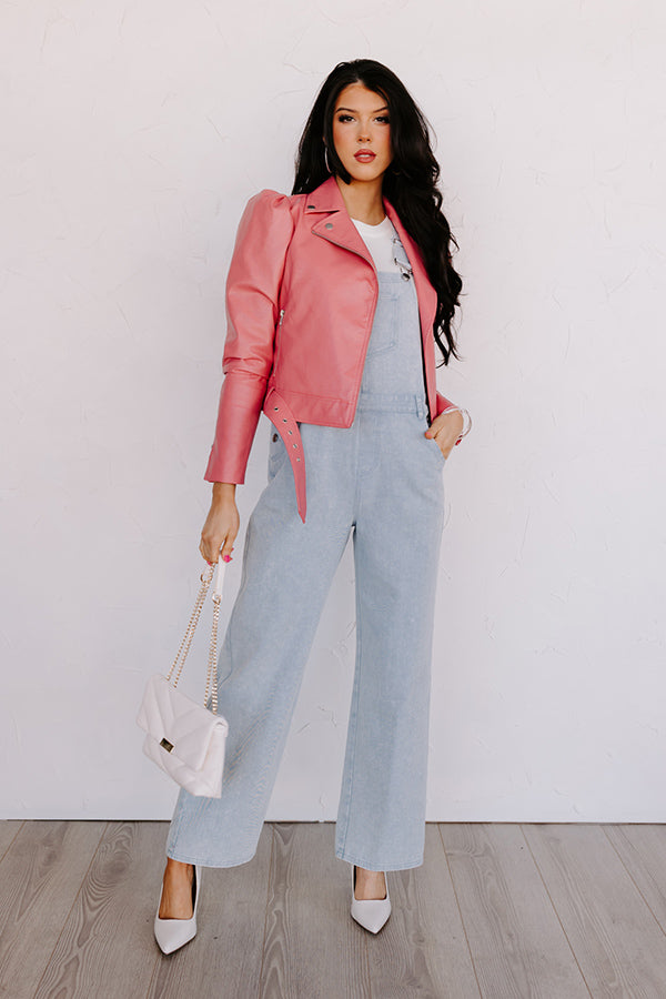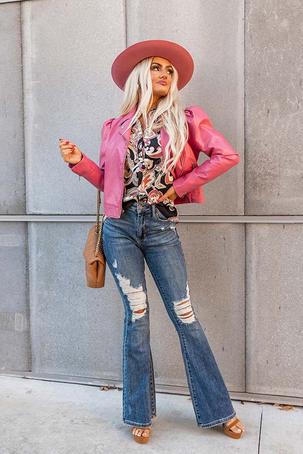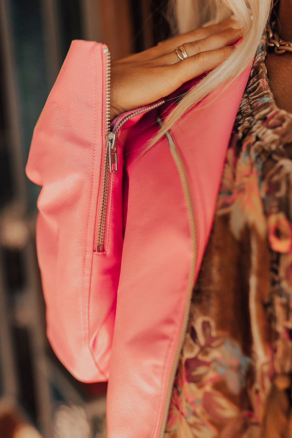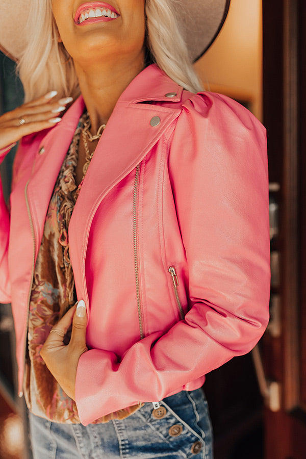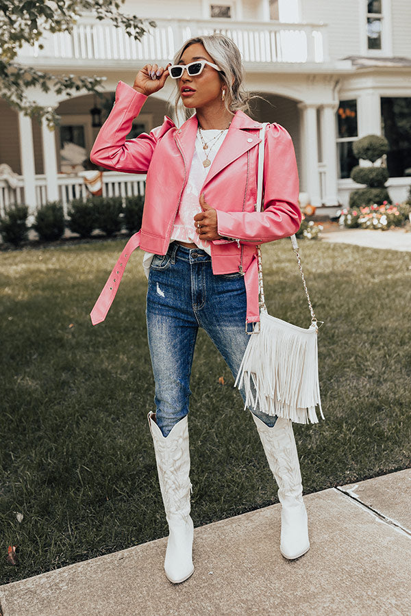 When in doubt...wear pink! Our gorgeous 'Starry' jacket features sleek faux leather material, a zip closure front with a collared neckline, long sleeves, accent zip closure side pockets, and a flattering silhouette that ends in a straight hemline with an accent belt!