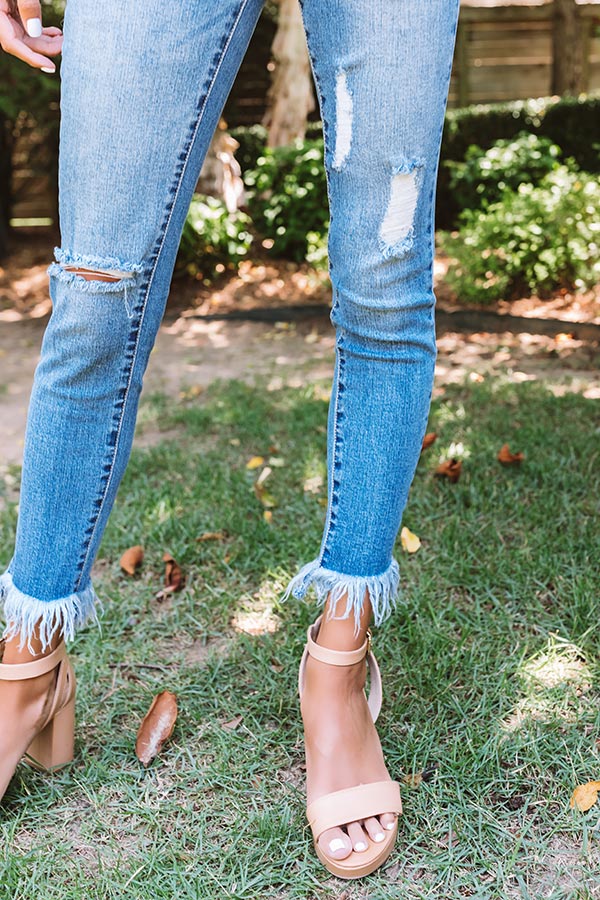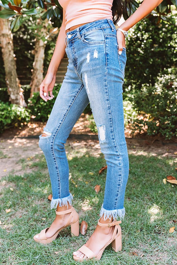 These pants are sure to fit you in all the right places, as they should! The 'Stiles' bottoms feature lightweight medium wash denim material with subtle accent fading, distressed detailing, a mid-rise waist with belt loops, a classic 5-pocket cut, a hidden zip fly with a button closure, and a form fitting silhouette that falls into frayed ankle-length hems!