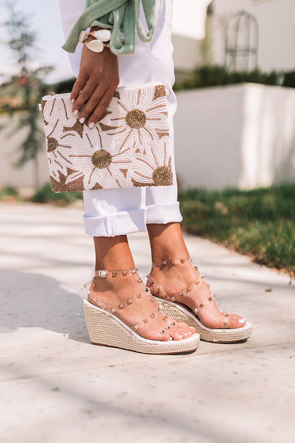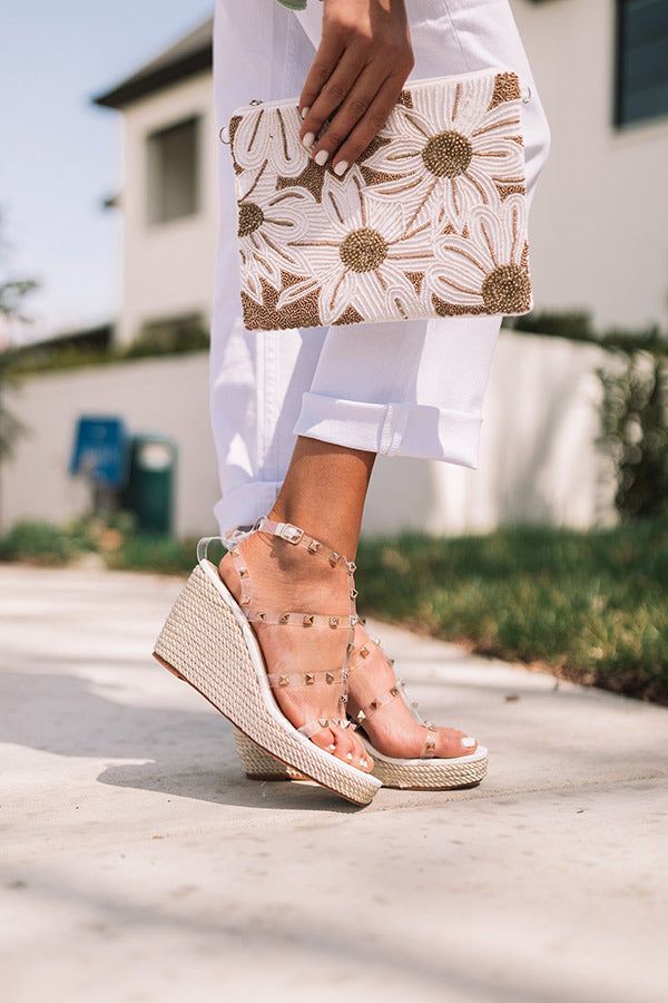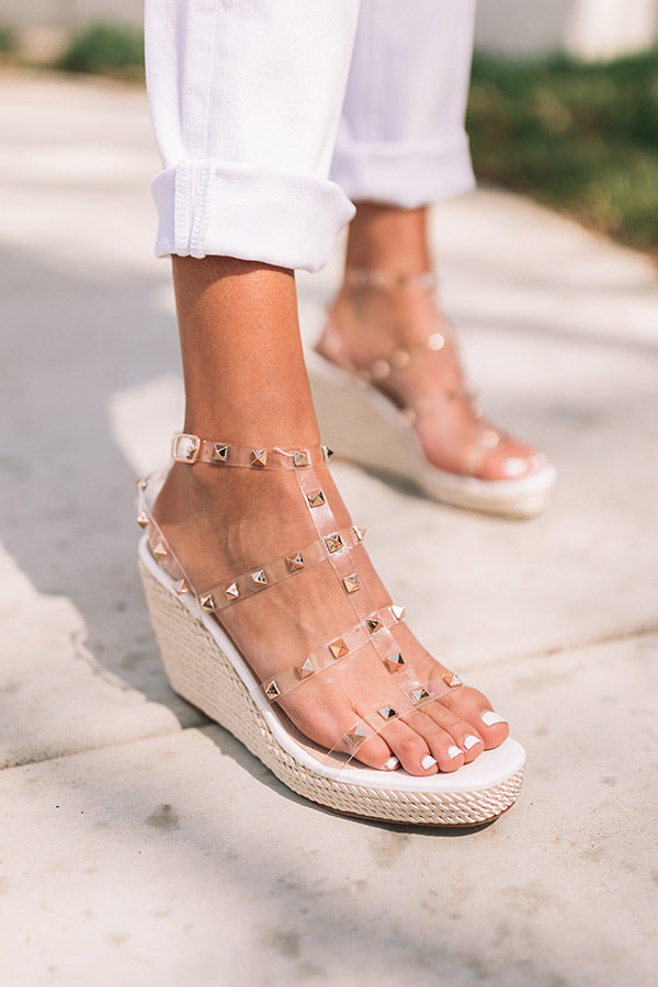 Put a little pep in your step with our chic clear 'Sunny' wedge featuring a strappy silhouette with gold stud detailing, a 3.5-inch wedge height, a rounded open toe, and a buckled ankle strap! This wedge runs more true to size.