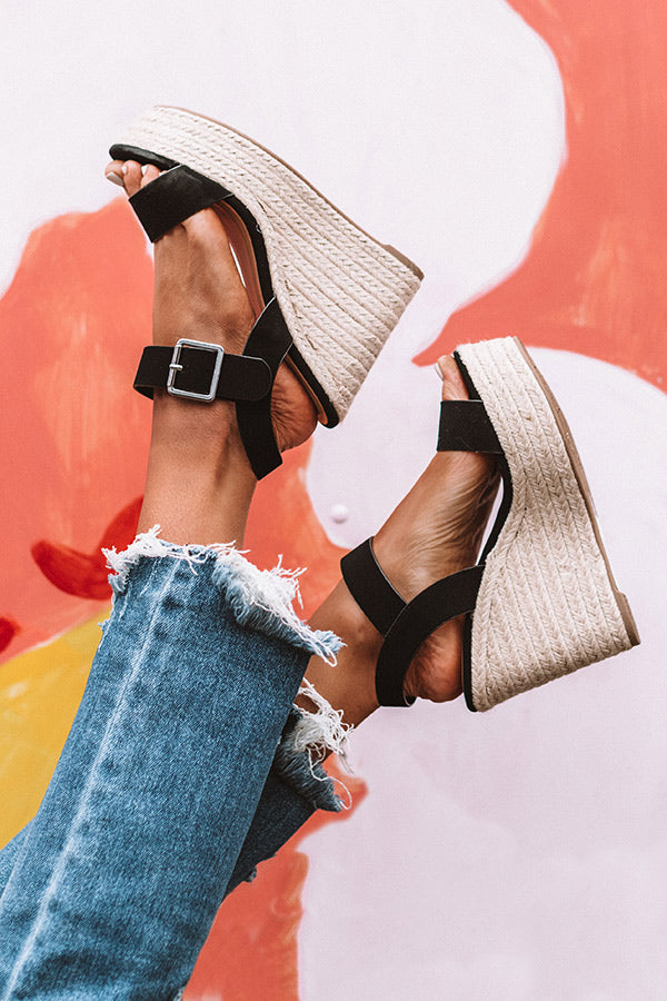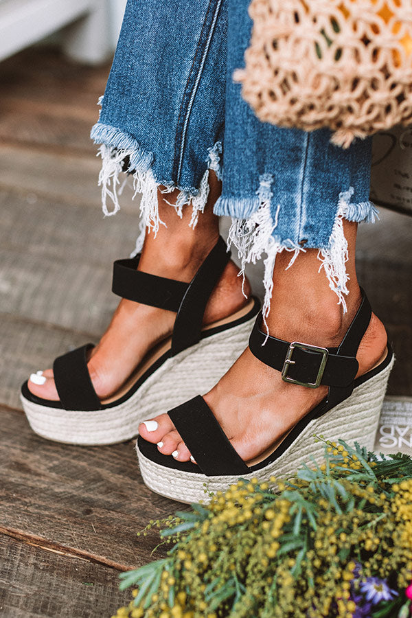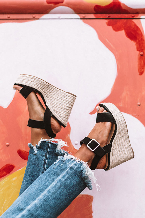 Good shoe take you to good places, so add our adorable black "Sydney Wedge" to your cart and have the summer of your life! They feature 4.5-inch heels with braided texturing, a wide over-the-foot strap, rounded open toes with platform soles, and bucked ankle straps with open heel silhouettes!