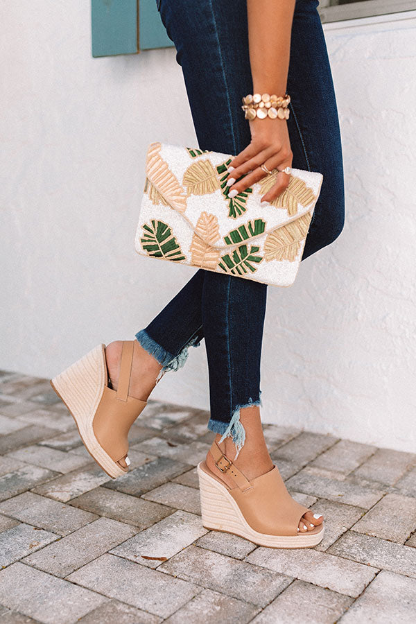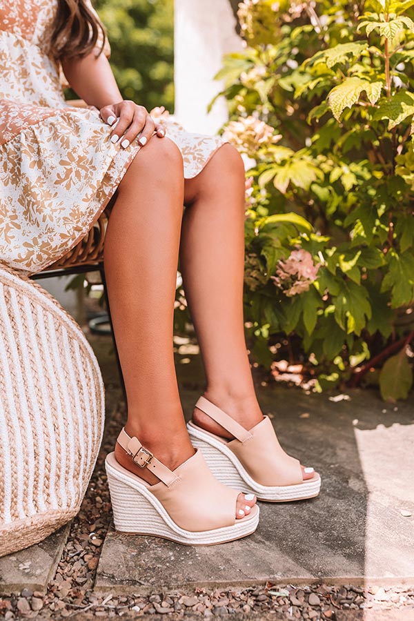 Transition from season to season in style with our adorable tan 'Sylvie' wedge featuring lightweight faux leather material, 4.5-inch jute wedges, square peep toes, and buckled ankle straps! These wedges run more true to size.