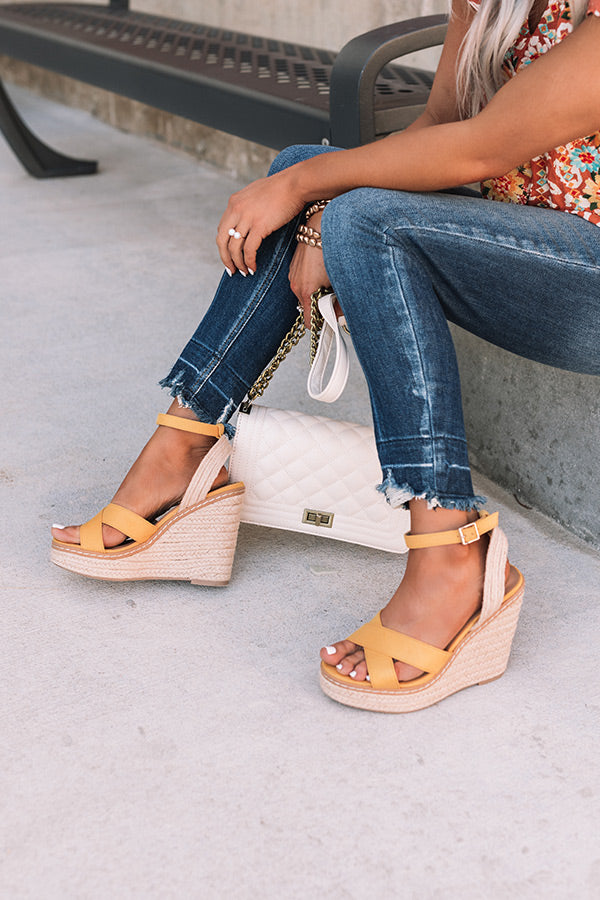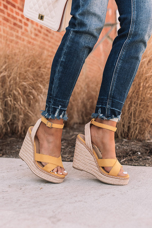 Strut into the warmer months in style with our adorable honey colored 'Syra Espadrille' featuring two crossed over-the-foot straps, a rounded open toe, a 3.5-inch wedged heel, and an open heel with a buckled ankle strap! This wedge runs more true to size.