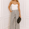 - Step up your style with these adorable pants! The playful striped design adds a bold, eye-catching touch to any outfit. - Unlined lightweight material with a black and white strip pattern - A hidden zip fly and button closure - Functional front and back pockets - A wide leg silhouette that ends in straight, cuffed hemlines