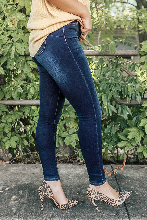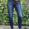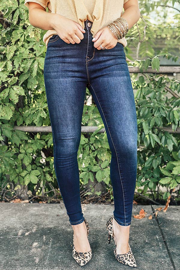 Create a polished look in minutes with the "Taylor High Waist Skinny Jeans." These dark denim skinny jeans have a flattering high-waisted fit, a great stretchy fitted feel, a skinny pant leg with subtle fading & whiskering & an ankle-length hem.