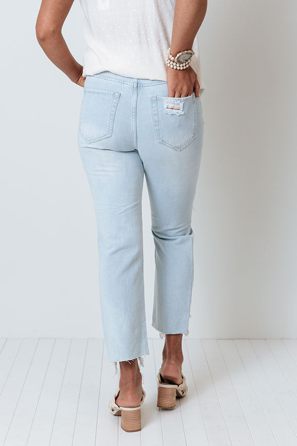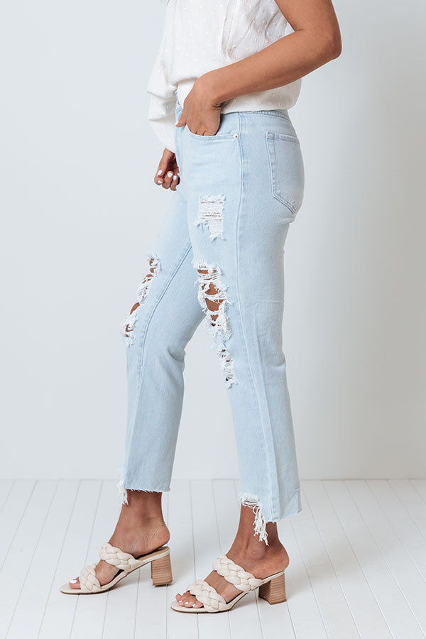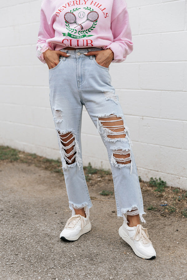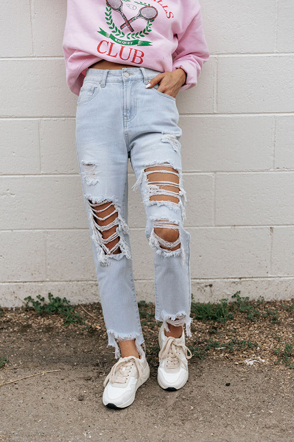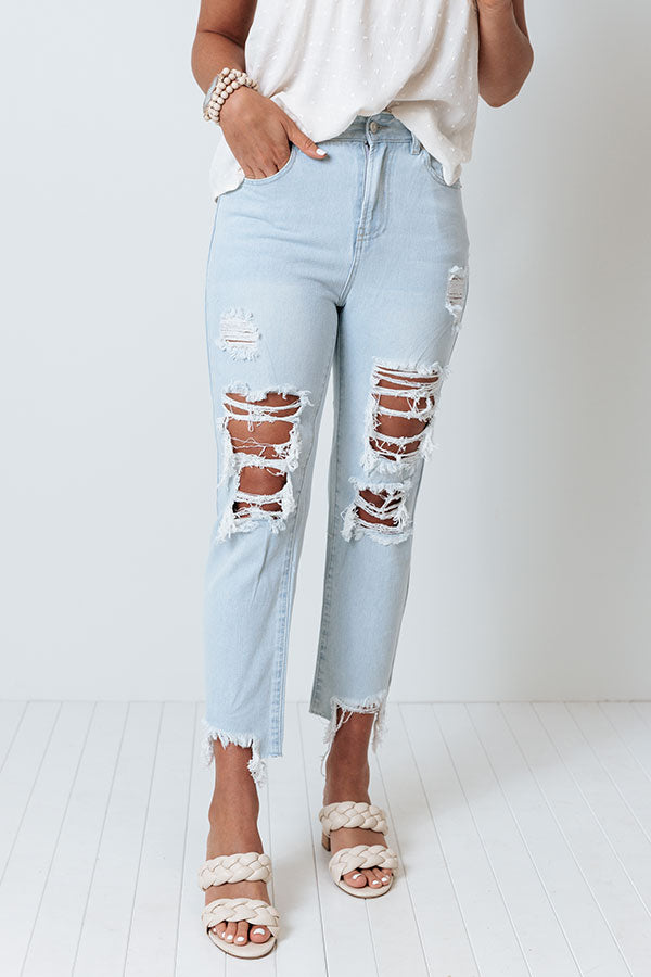 The trendiest summer denim just dropped! Our timeless 'Terrain' relaxed jean features lightweight light wash denim material with subtle accent fading and distressed detailing, a high waistline with belt loops, a classic five pocket cut, a hidden zip fly with a button closure, and a flattering silhouette that falls into ultra frayed hemlines!