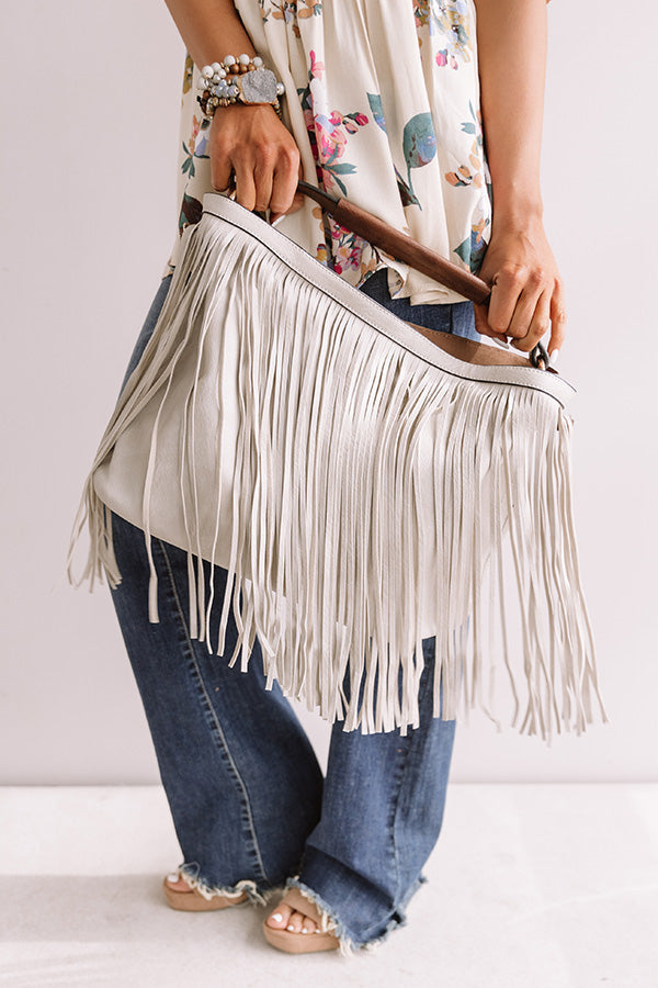 There is no better time than now to add this adorable grey tote to your cart with its sleek faux leather material, ultra long fringe detailing, a wide single handle, and a spacious rectangular shaped pouch with additional inside pockets!