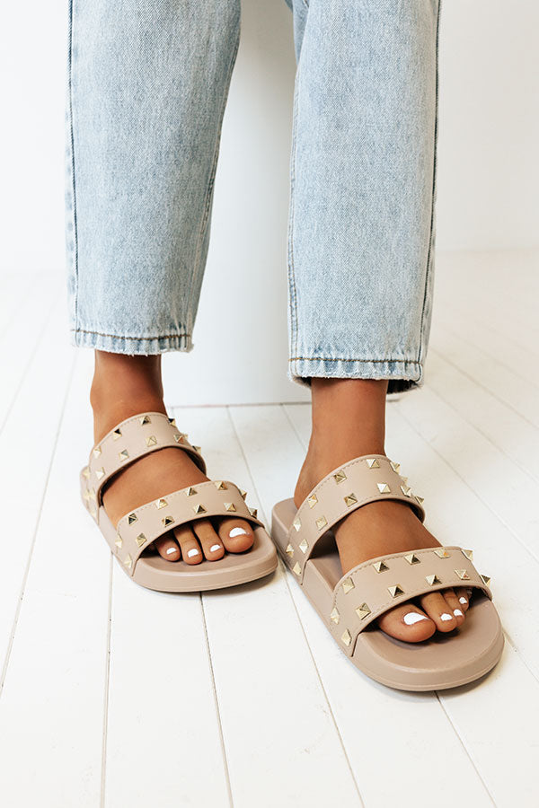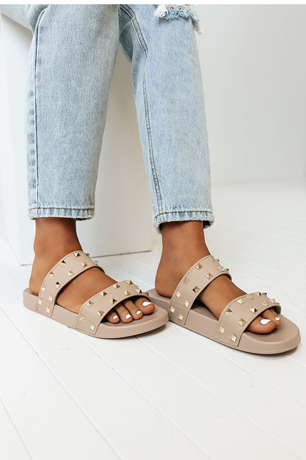 A glamorous twist on a sporty silhouette, our luxe taupe colored 'Tish' sandal featuring two wide over-the-foot straps with gold stud detailing, a rounded open toe, a comfortable flat sole, and a lightweight slip-on silhouette! This sandal runs more true to size.