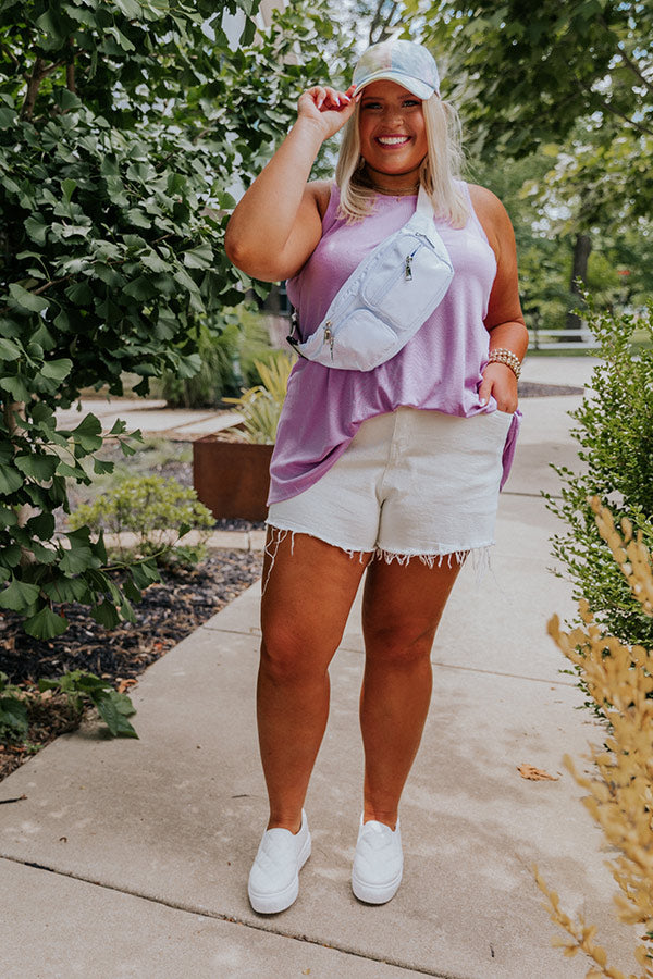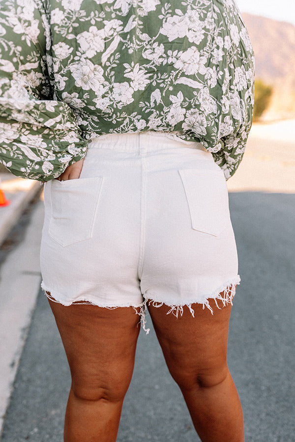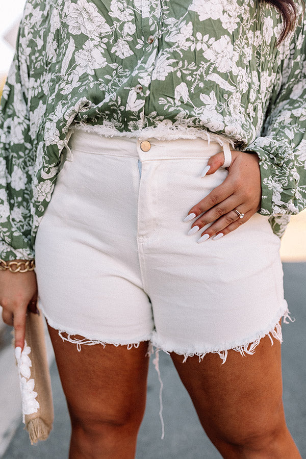 Plus Size - Keep cool all summer long with our trendy white 'Toori' shorts featuring lightweight material, a high waistline with belt loops, a classic four pocket cut, a hidden zip fly with a button closure, and a relaxed silhouette that ends in frayed upper-thigh length hemlines!