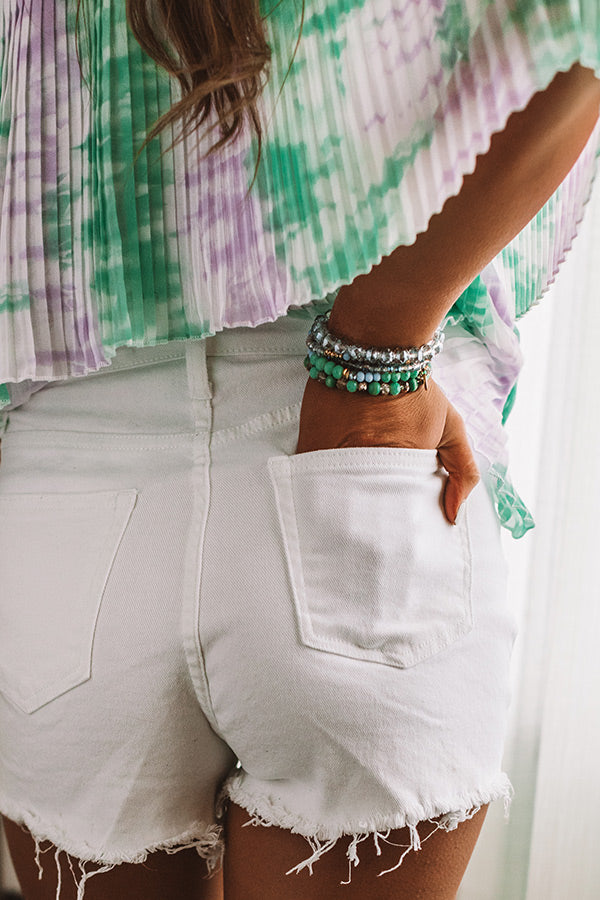 The adorable white "Tory" shorts feature lightweight stretchy denim material, distressed detailing, a high waist fit, a hidden zip fly with a button closure, belt loops, five pocket cuts, and a relaxed silhouette that falls into ultra frayed raw cut upper thigh length hemlines! Style with your favorite basic tee, tank, or lightweight sweater, an oversized tote or a crossbody, sunnies, and some neutral wedges or colored sandals for the most relaxed summer look yet!