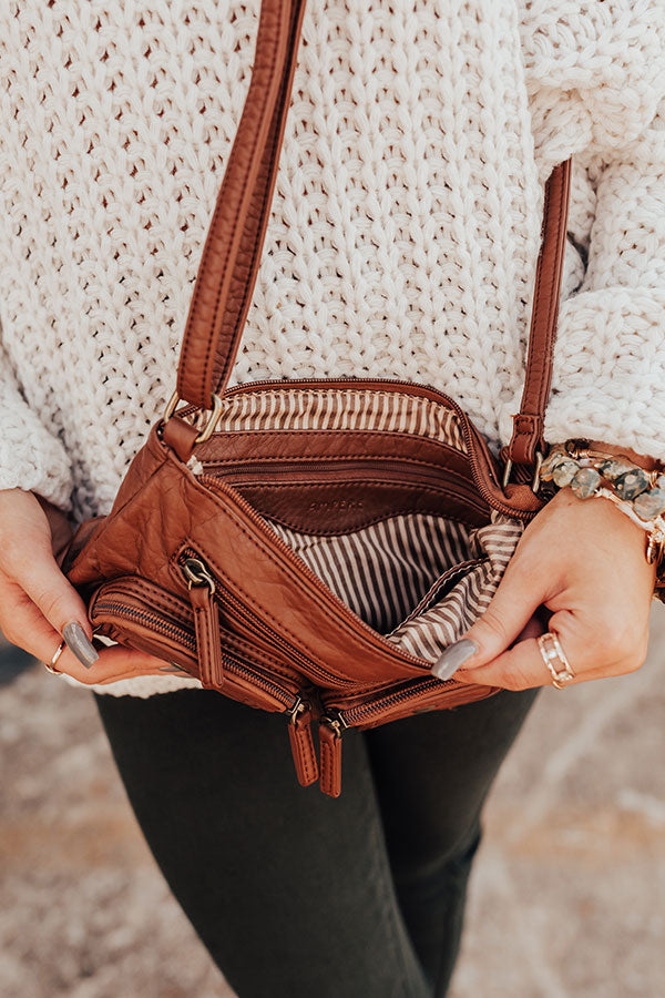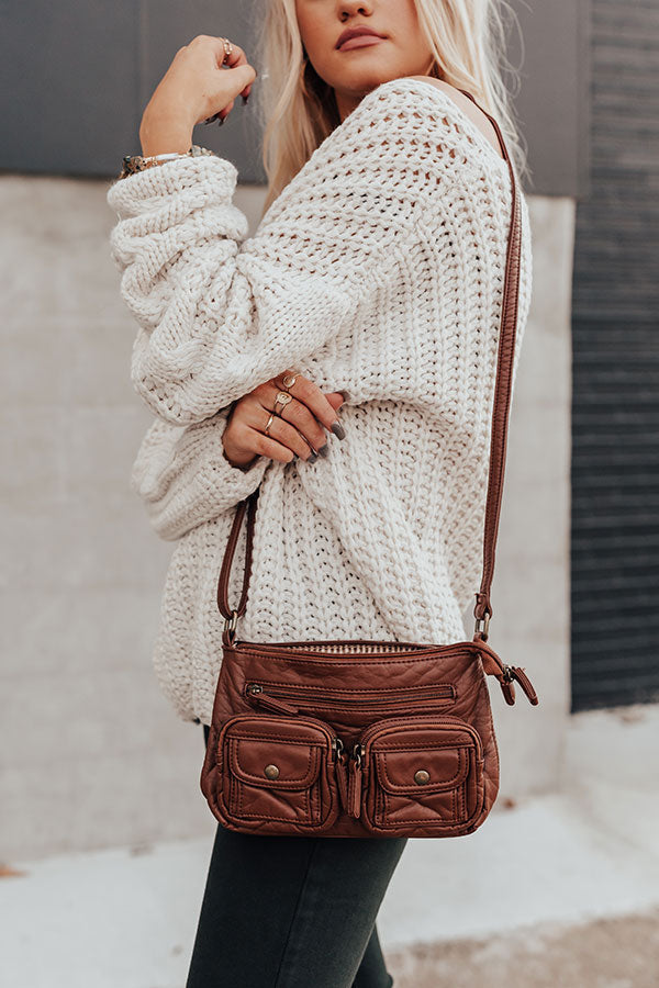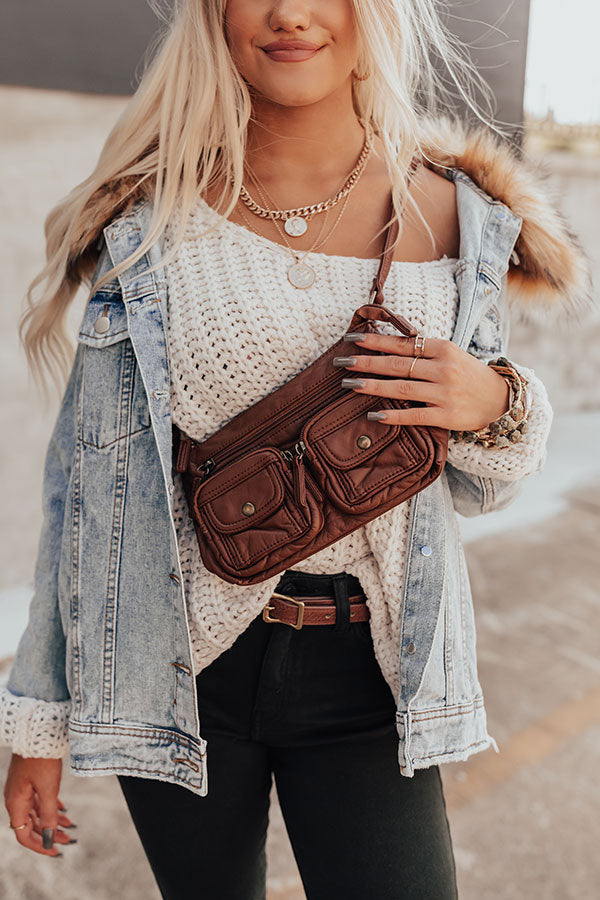 Take the world by storm with 'The Traveler Crossbody' featuring sleek brown material, an adjustable shoulder strap, two outer accent pockets, and a lightweight fully lined pouch with a zip closure and additional inside pockets!