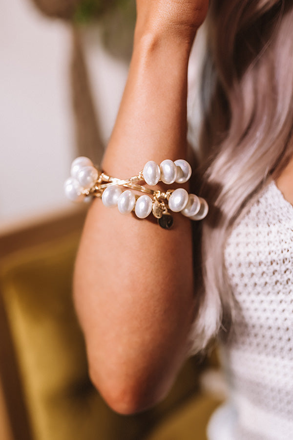 The "Treva" bracelet features a gold plated brass wire-wrapped bangle adorned with three faux pearl clusters!
