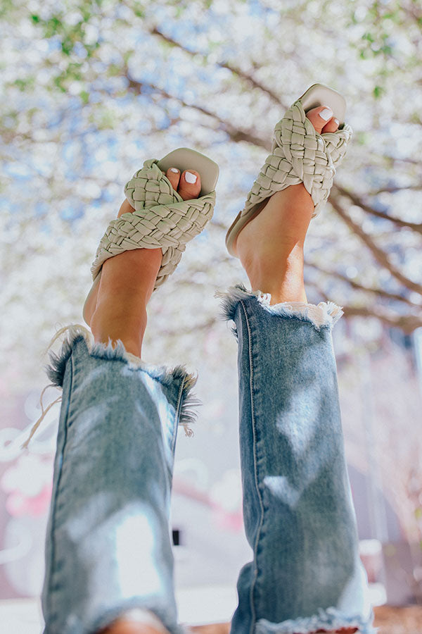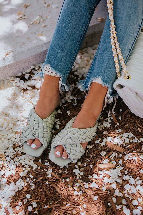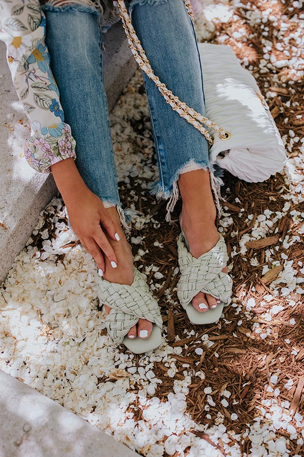Slide into summer in our timeless light sage hued 'Trudie' sandal featuring two wide braided and crossed over-the-foot straps, a square toe, a flat sole, and a lightweight slip-on silhouette! This adorable sandal runs more true to size.