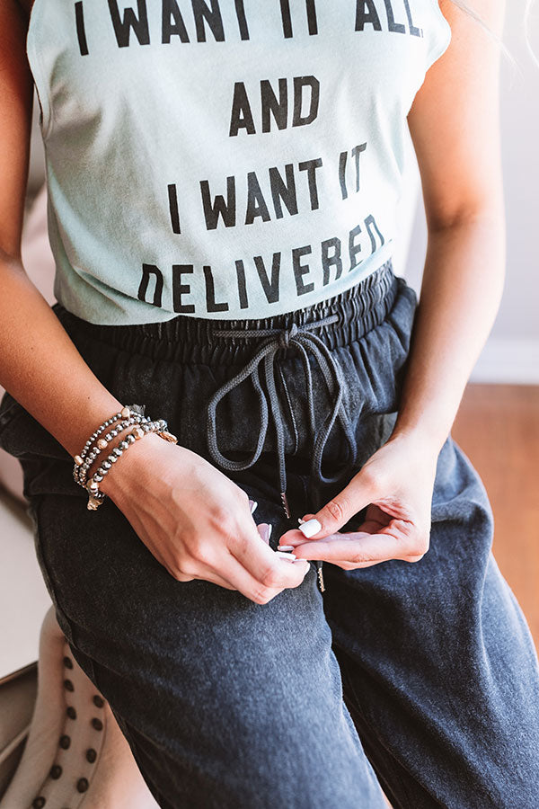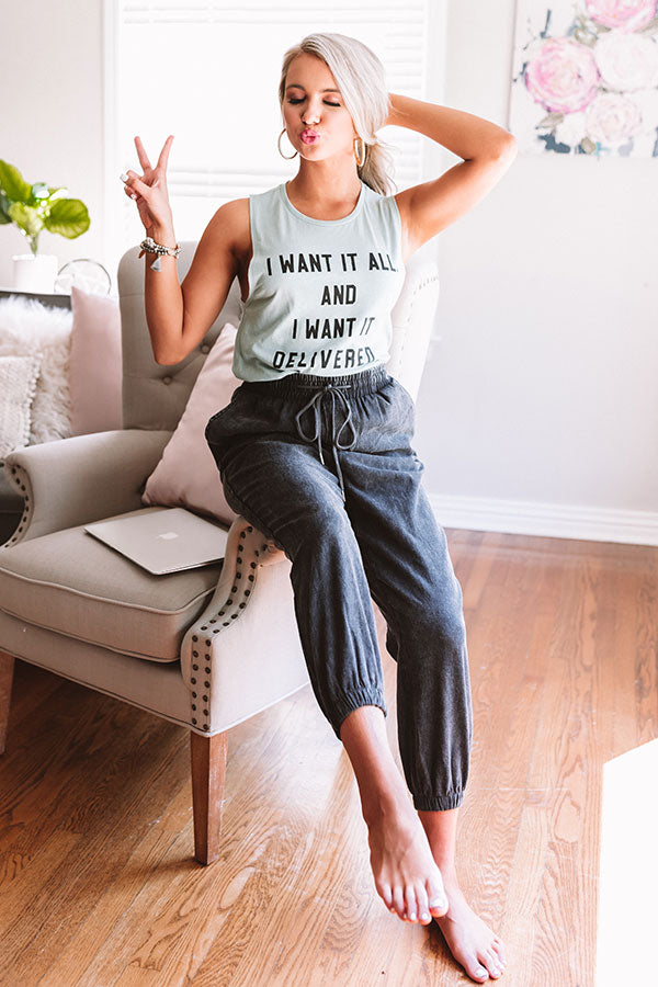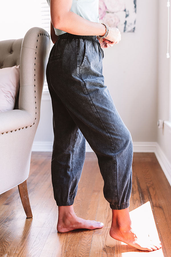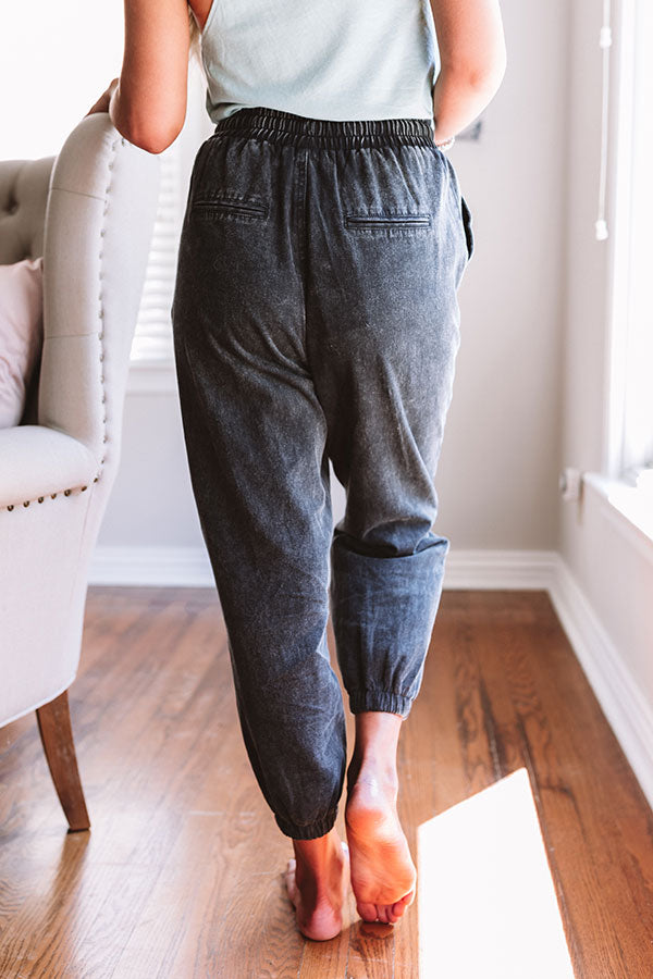 Our cozy "Tucker" joggers feature ultra soft lightweight chambray material with dark wash coloring, an elastic waistline with a tie belt closure, two side pockets and two accent faux pocket cuts in the back, and a relaxed pants silhouette that falls into fitted mic-calf length hemlines! We have styled these cuties with a trendy tank top, but you can also wear it with a basic white tank under a cropped jean jacket, our white "Camber Perforated Bootie," sunnies, and our "Style Above The Rest Faux Leather Bucket Bag in White!" Measurements