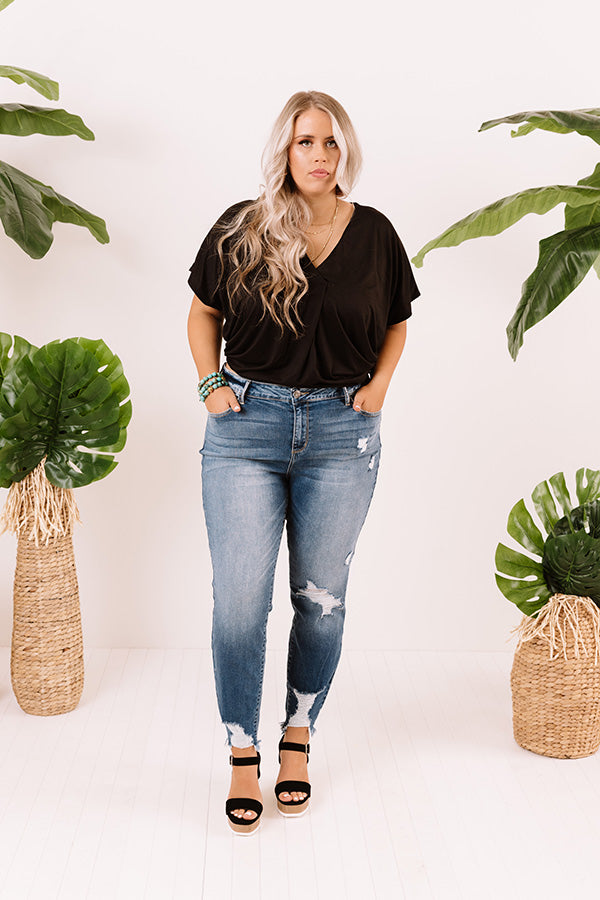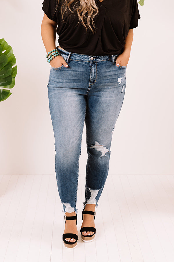 Plus Size - Life is more than just fitting into your jeans, but we believe you will LOVE the look and feel of our adorable 'Tyla' skinnies featuring lightweight medium wash denim material with distressed detailing and subtle accent fading, four pocket cuts, a hidden zip fly with a button closure, a midrise waistline with belt loops, and a flattering form fitting silhouette that falls into raw cut ankle-length hemlines!