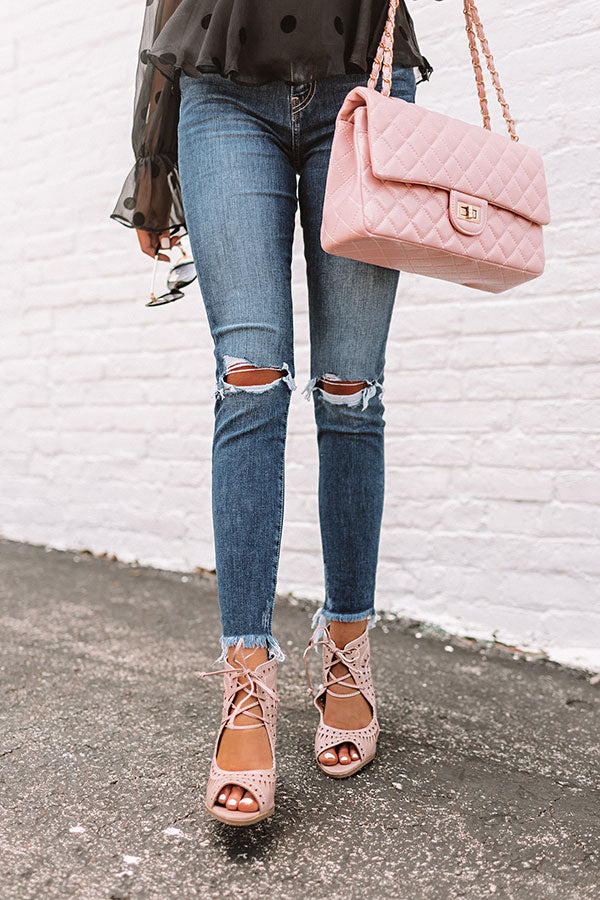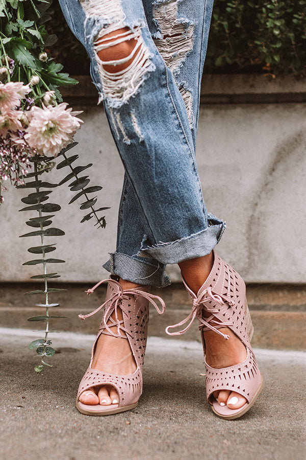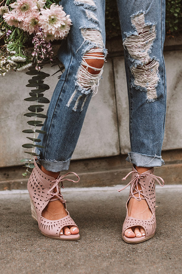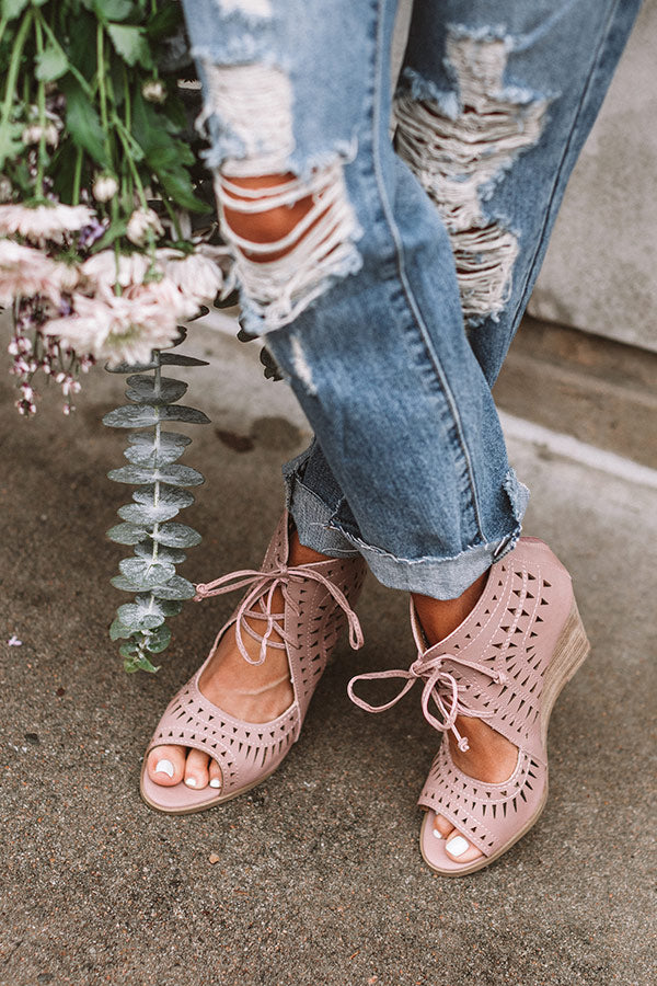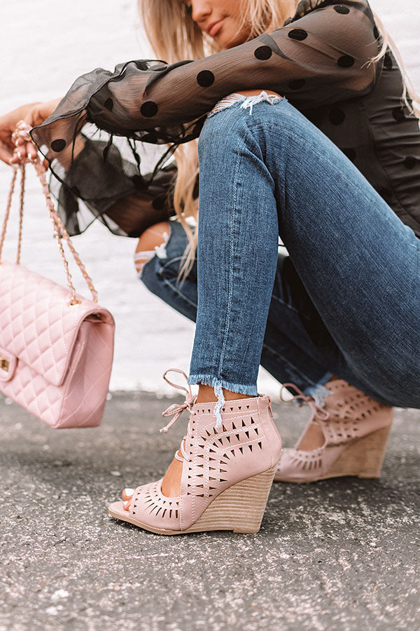It's official...we have found the cutest summer shoe "The Underwood Faux Leather Wedge in Blush" They feature a peep toe with a foot strap and a high ankle with cutout detailing, a lace up front, and zip up back!