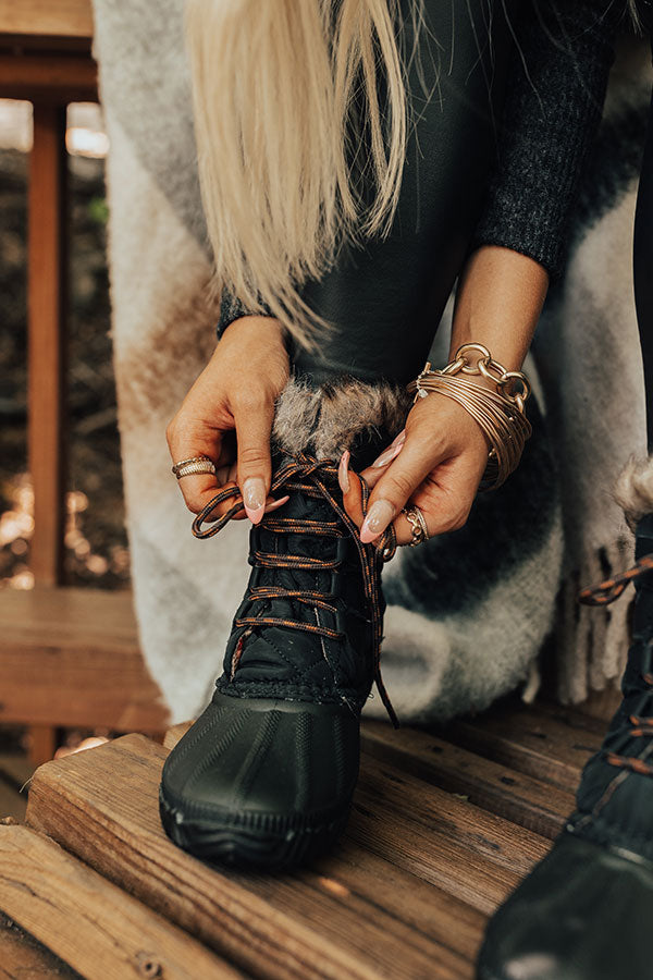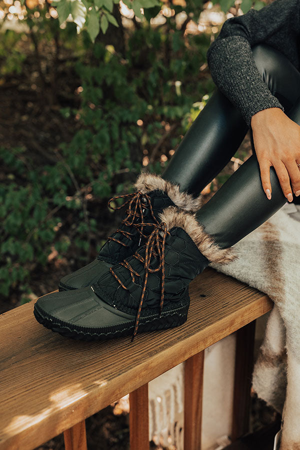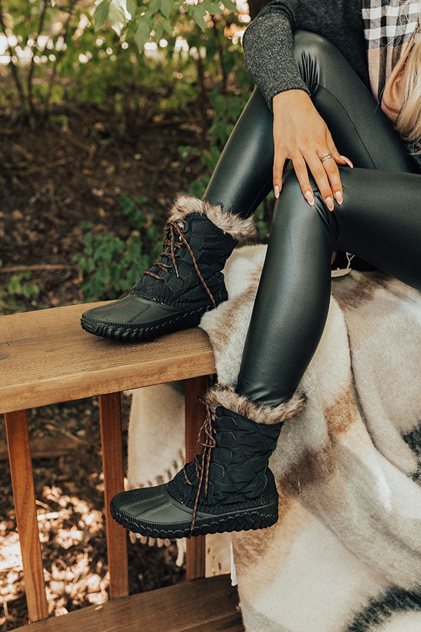 Take on any weather while still looking stylish in our adorable black 'Utah' boot featuring quilted outer material lined with warm flannel and faux fur around the opening, a rounded rubber toe, a flat sole, and an above-the-ankle lace-up silhouette! This boot runs more true to size.