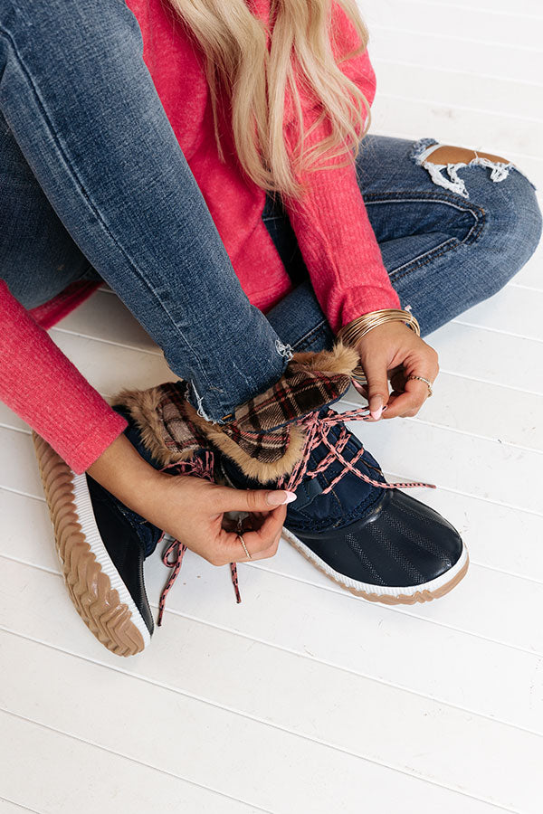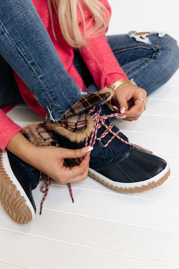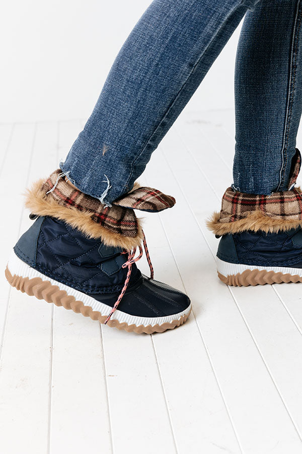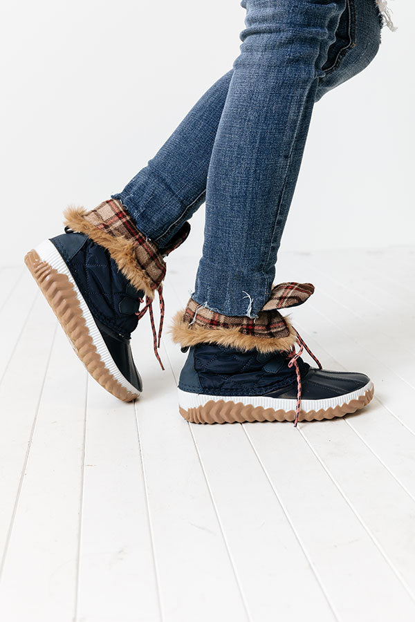Take on any weather while still looking stylish in our adorable navy 'Utah' boot featuring quilted outer material lined with warm flannel and faux fur around the opening, a rounded rubber toe, a flat sole, and an above-the-ankle lace-up silhouette! This boot runs more true to size.