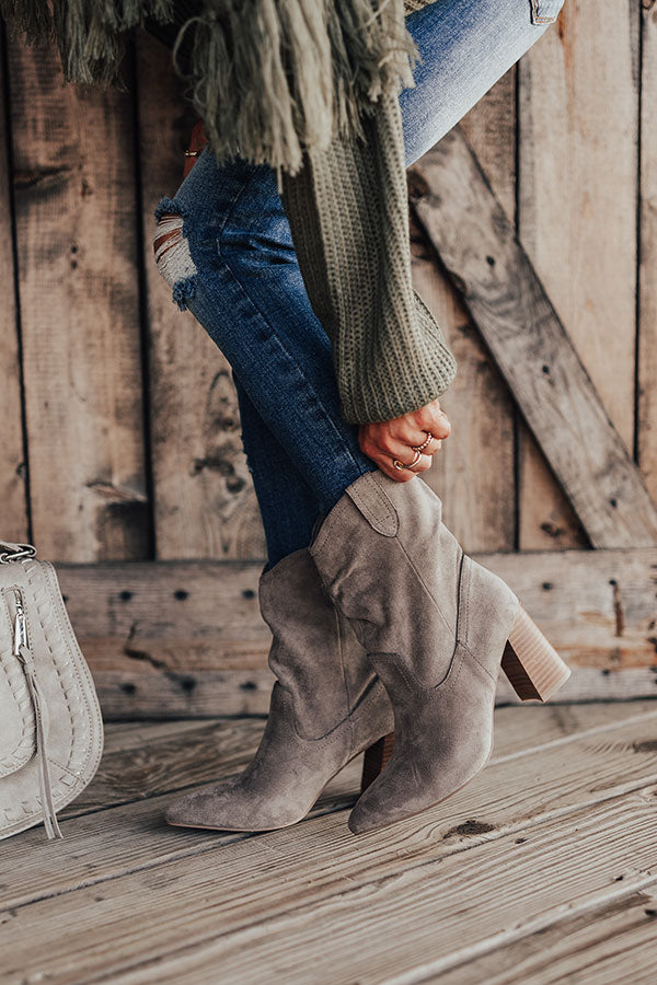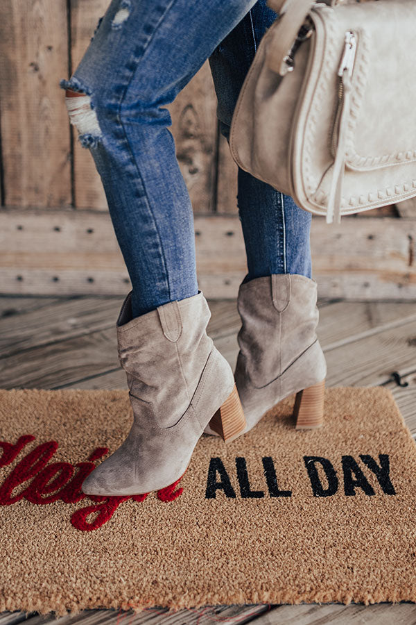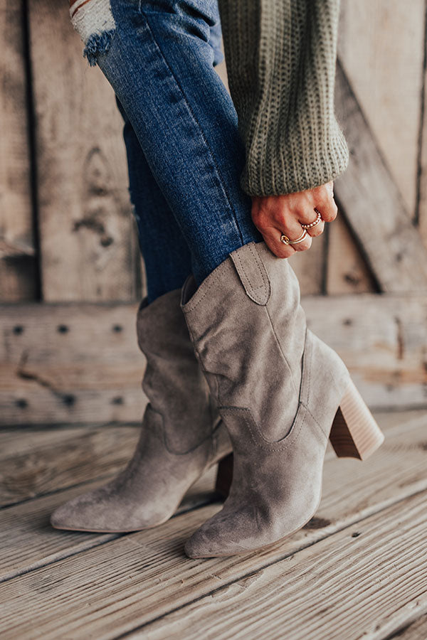 Our versatile grey "Valley" bootie was made for walkin' with its faux suede material, pointed closed toes, block heels, and lightweight relaxed above-the-ankle silhouette! For a more comfortable fit, we recommend ordering a 1/2 size up from what you typically wear. For example, if you normally wear a size 7, we recommend ordering a size 7.5.