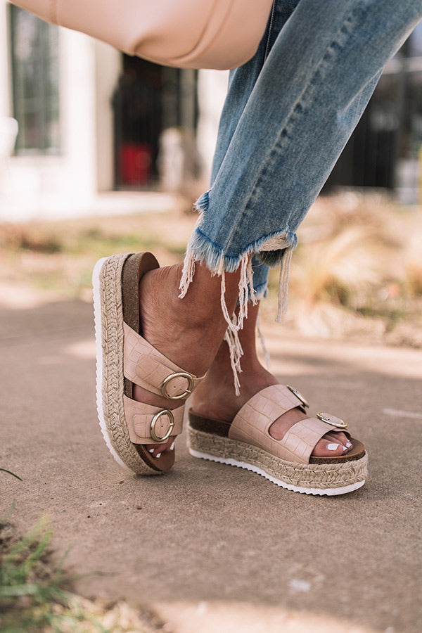 Slide into summer in style with our adorable 'Villa Espadrille' featuring two wide beige hued over-the-foot straps with circle buckles, a rounded open toe, a flat lifted sole, and a lightweight slip-on silhouette! This espadrille runs more true to size.