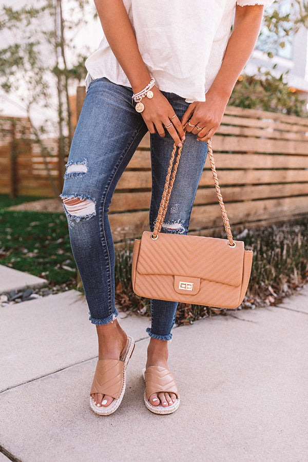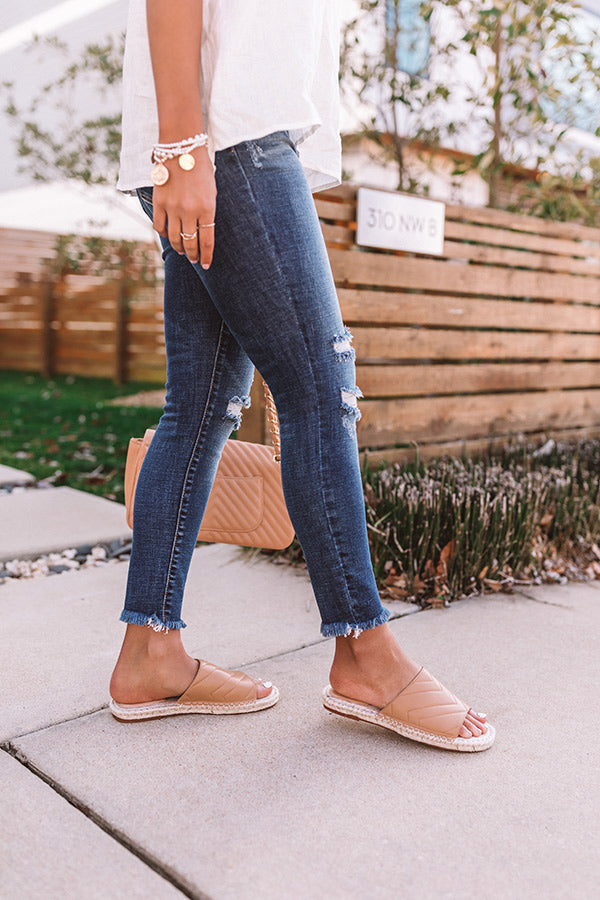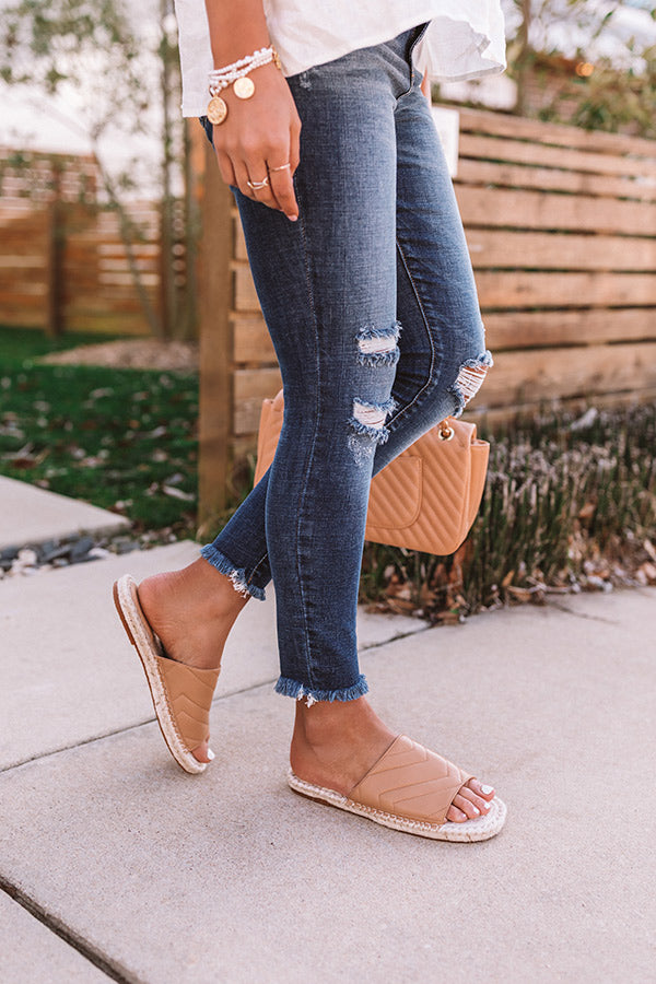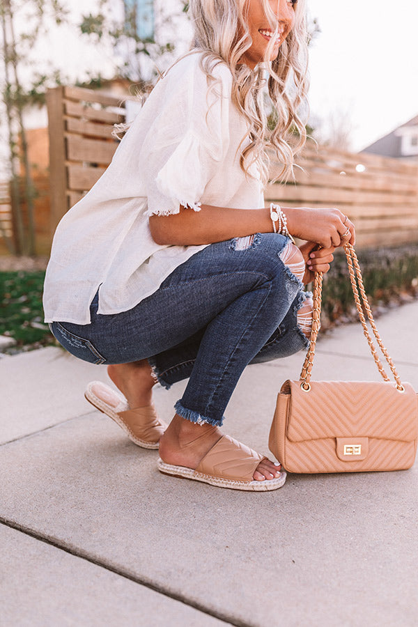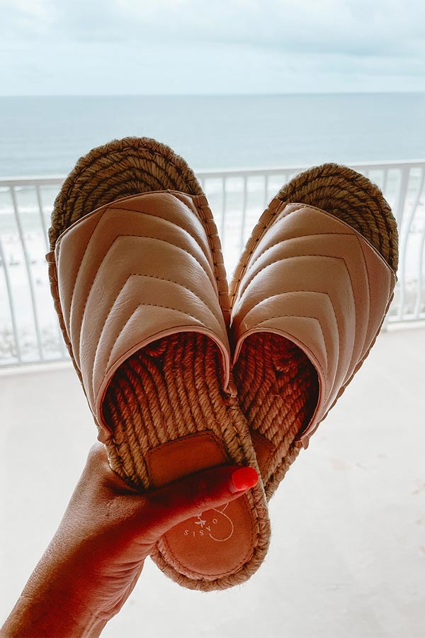 Slip into style with our trendy iced mocha colored 'Villa' sandal featuring a wide faux leather over-the-foot strap with diagonal quilted texturing, a rounded open toe, a flat woven sole, and a lightweight slip-on silhouette! These sandals run more true to size.