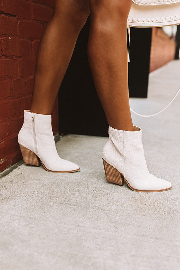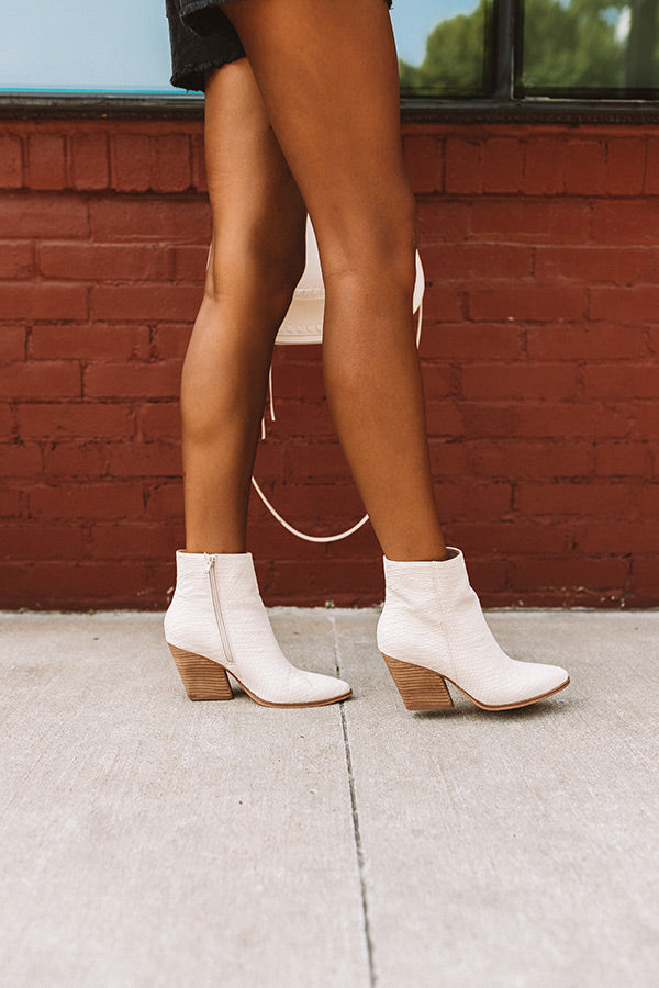 Stay groovy in our trendy white 'Vinny' bootie featuring sleek faux leather material, a pointe closed toe, a 3.5-inch block heel, and a zip inside closure! This bootie runs more true to size.