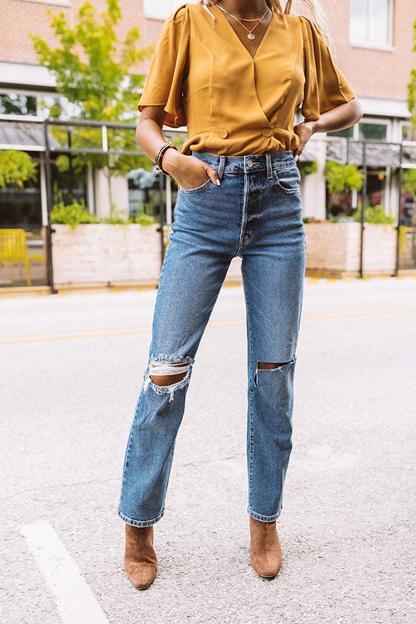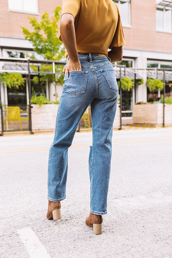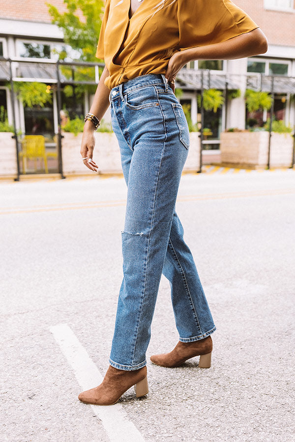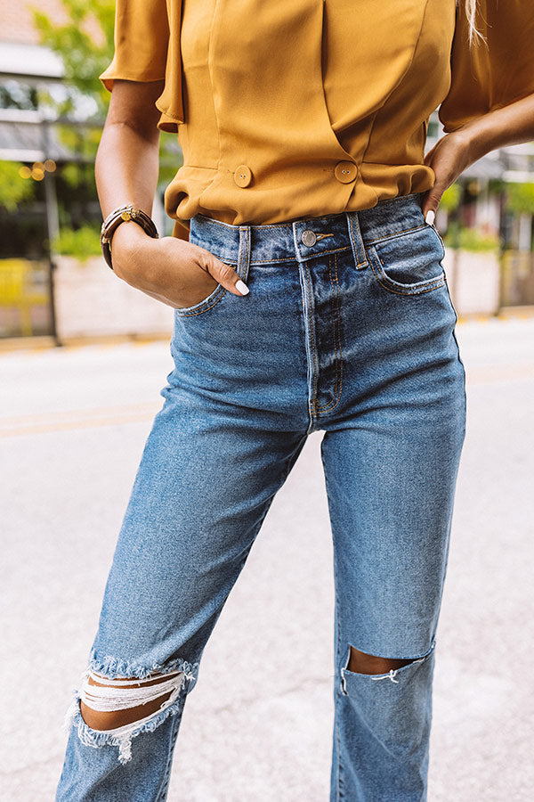 Upgrade your wardrobe denim with our flirty 'Vinny' jean featuring lightweight medium wash material with destroyed knee detailing and accent fading, a high waistline with belt loops, a classic four pocket cut, a hidden zip fly with a button closure, and a relaxed but flattering silhouette that falls straight into ankle-length wide leg hemlines!