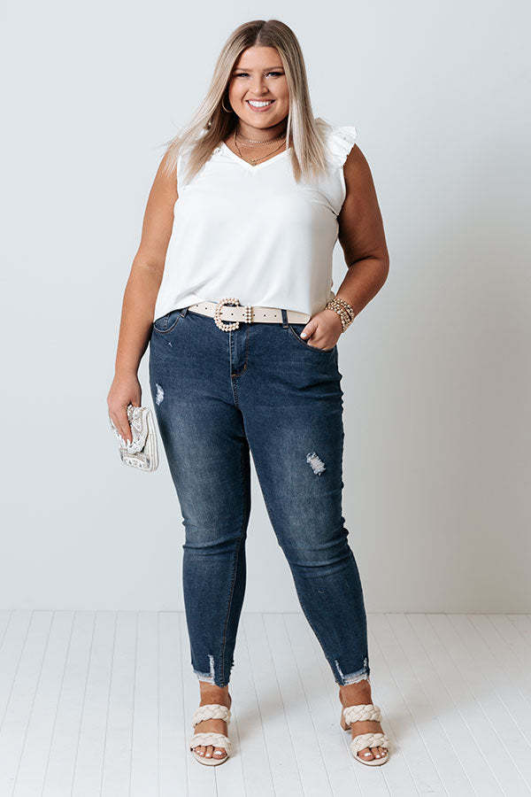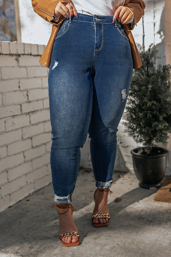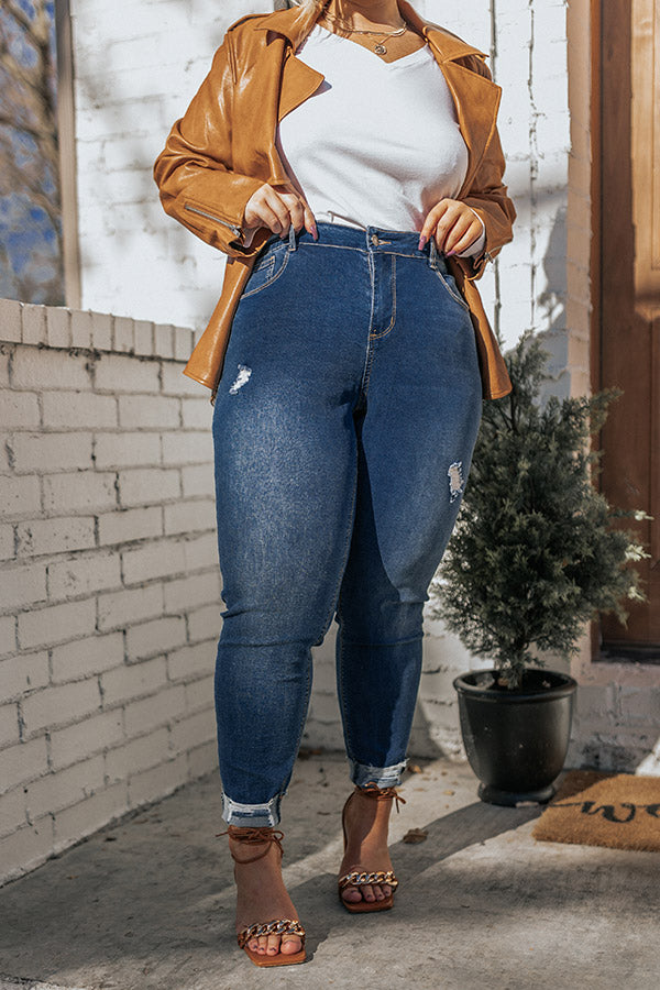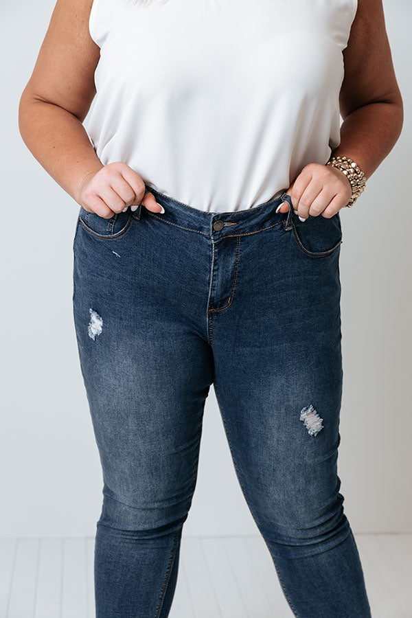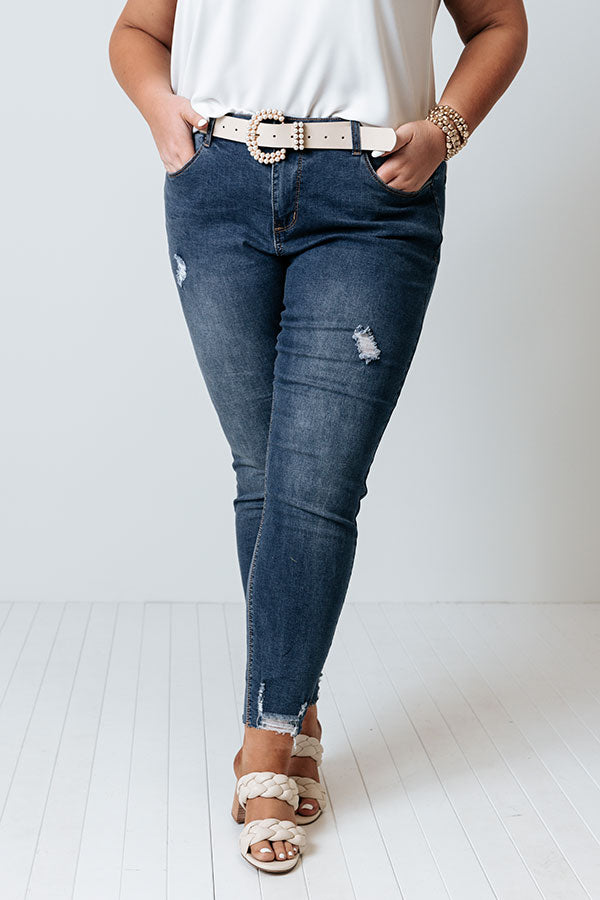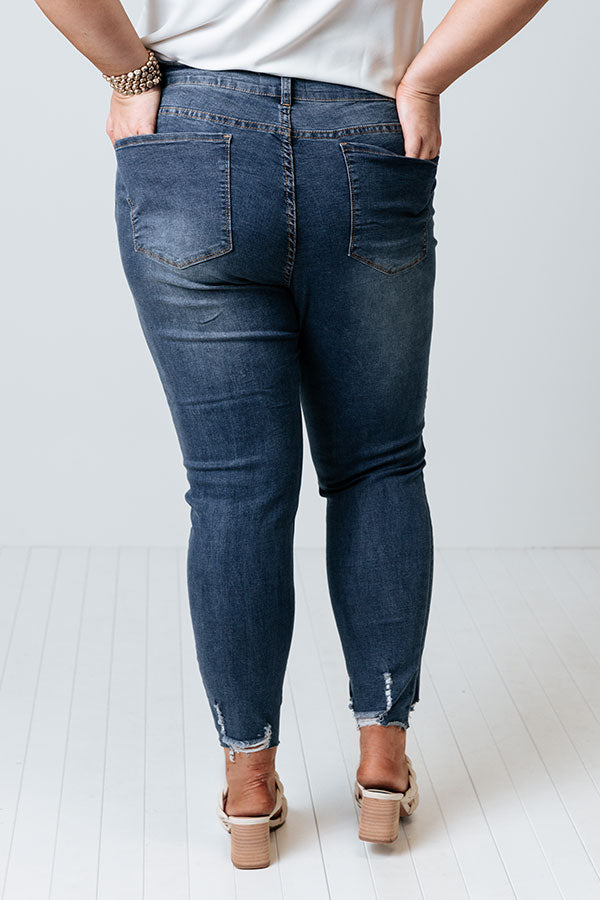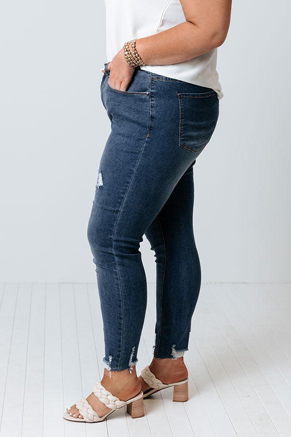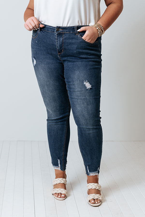 Plus Size - Life is more than just fitting into your jeans, but we believe you will LOVE the look and feel of our 'Viv' skinnies featuring lightweight medium wash denim material with subtle accent fading and distressed detailing, a high waistline with belt loops, a classic five pocket cut, a hidden zip fly with a button closure, and a flattering silhouette that falls straight into raw-cut ankle-length hemlines!