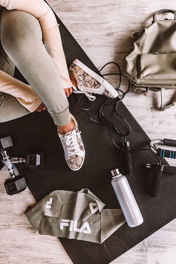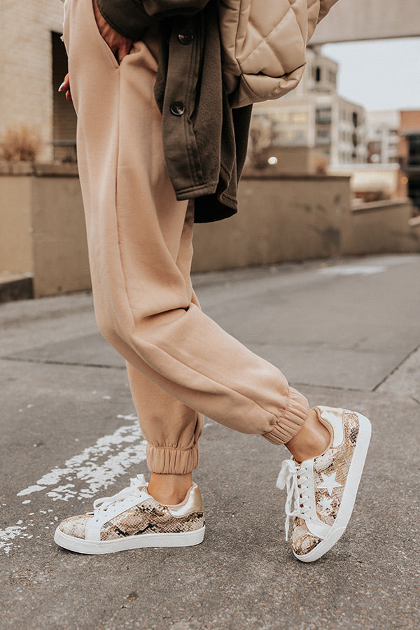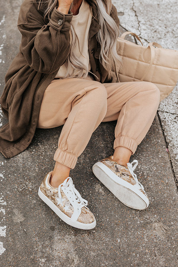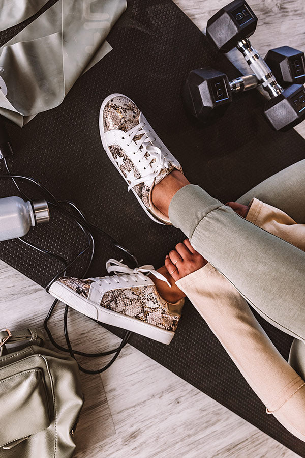 Run wild in our trendy "Wade" sneaker patterned with a gold/neutral and black snake print, accent stars on the side, rounded closed toes, flat white soles, and a lightweight lace up silhouette! This sneaker runs more true to size.