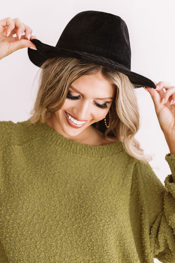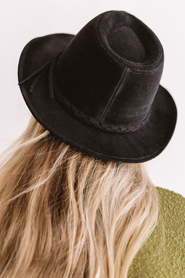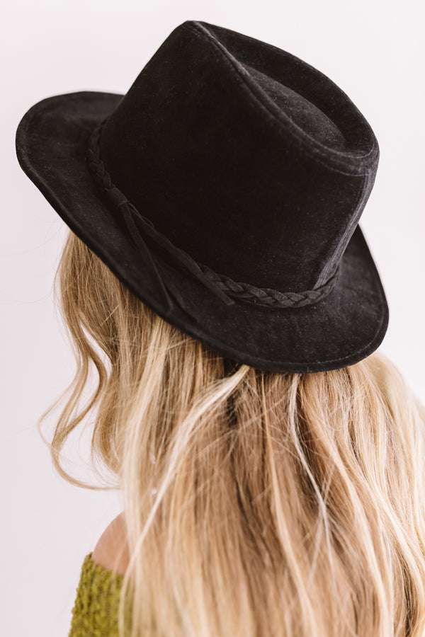 Top off your impeccable fall style with "The Waverly" black hat featuring soft faux suede material, a wide brim, and a black braided faux leather accent strap with a tassel!