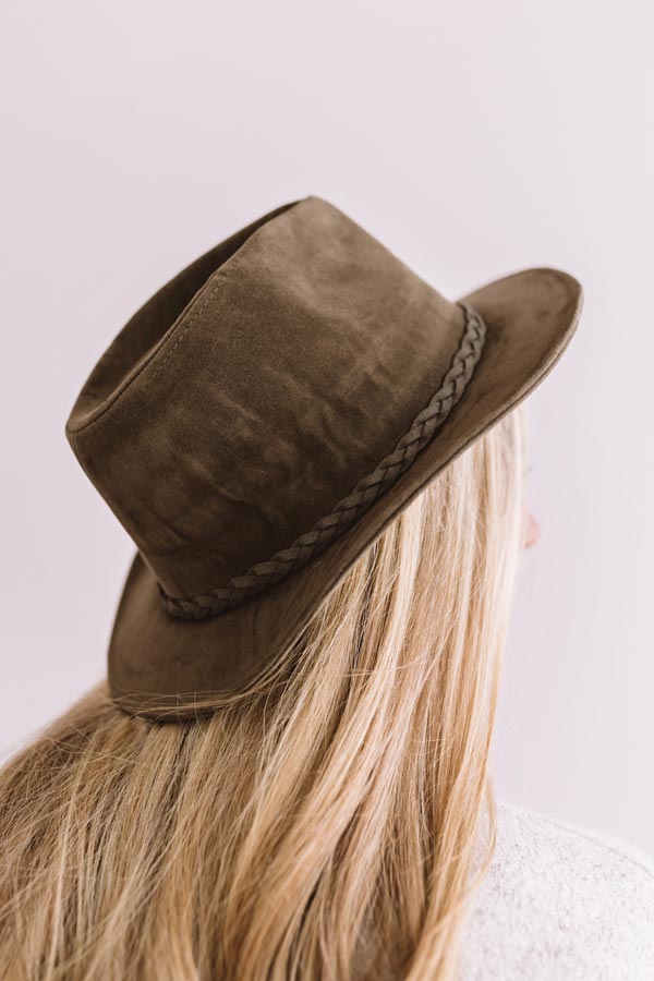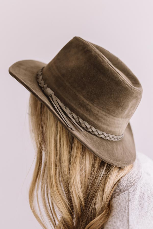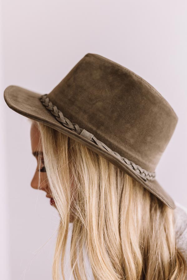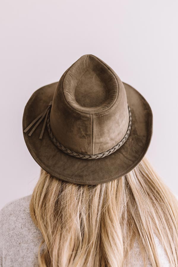 Top off your impeccable fall style with "The Waverly" olive hat featuring soft faux suede material, a wide brim, and a black braided faux leather accent strap with a tassel!