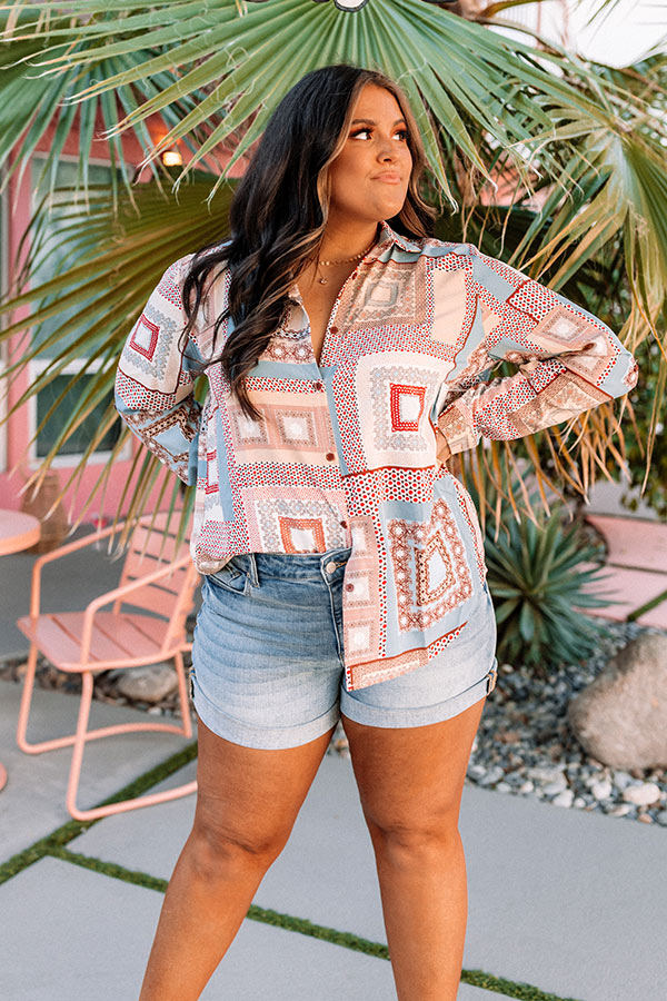 Strut through summer in effortless style with our plus size 'Wenden' shorts featuring light wash denim material with accent fading, a high waistline with belt loops, a hidden zip fly with a button closure, a classic four pocket cut, and a flattering figure hugging silhouette that ends in straight mid-thigh length hemlines that can be cuffed!
