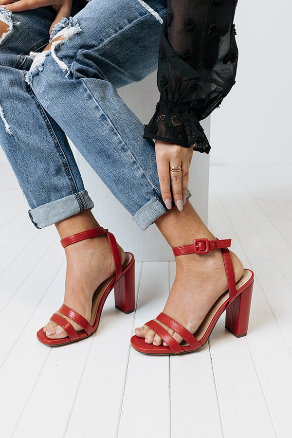 Add a flirty finish to your look with our red hot 'Wendy' heel featuring lightweight faux leather material, two skinny over-the-foot straps, an open heel with a buckled ankle strap, a rounded open toe, and a 4.5-inch block heel! This heel runs more true to size.