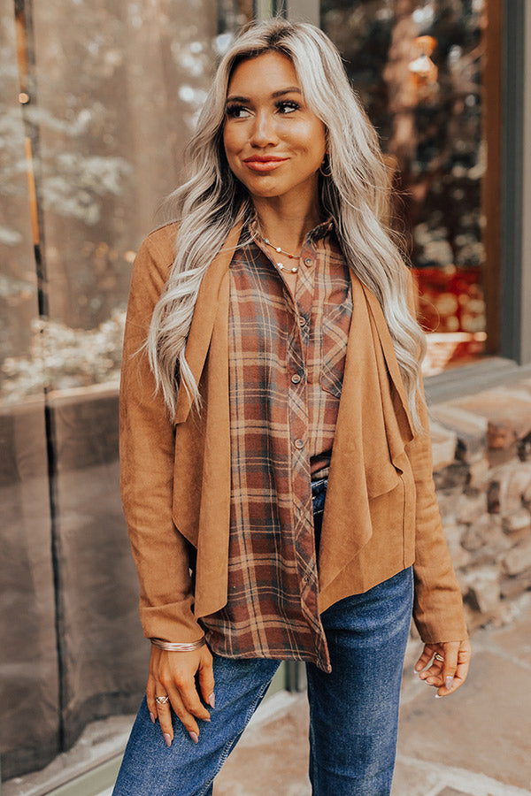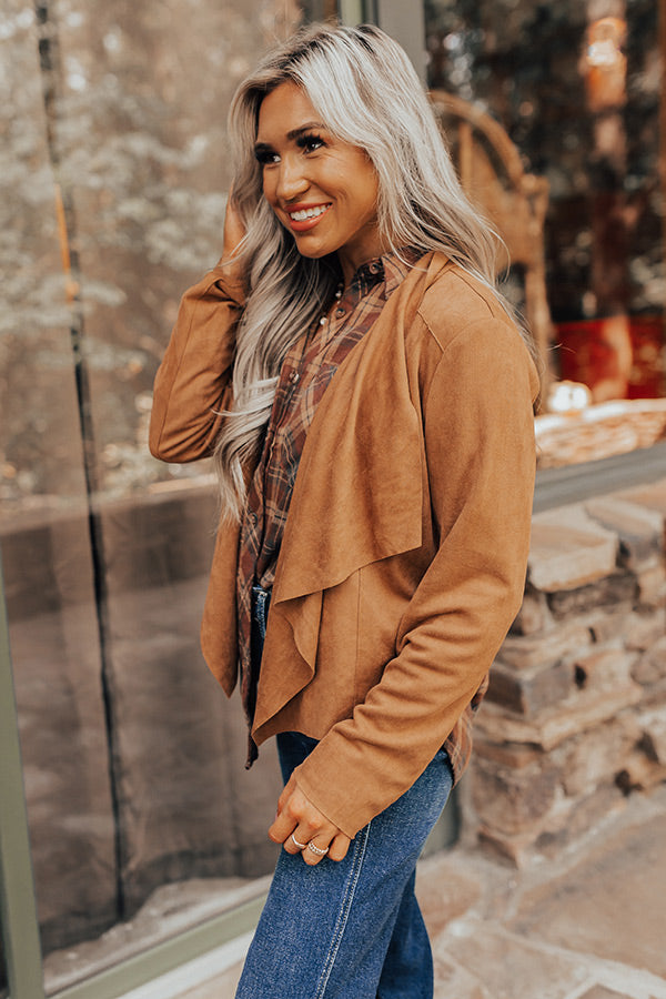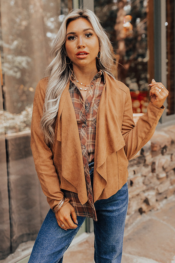 The perfect fall layering piece, our cute camel hued 'Westman' jacket features faux suede material, a draped collar, long sleeves, and a relaxed silhouette that ends in a straight hemline!