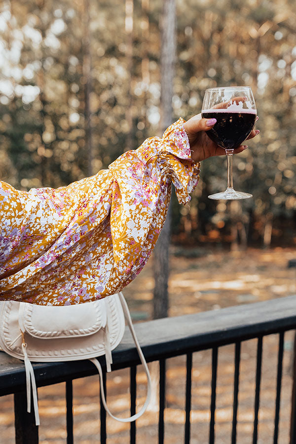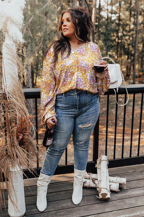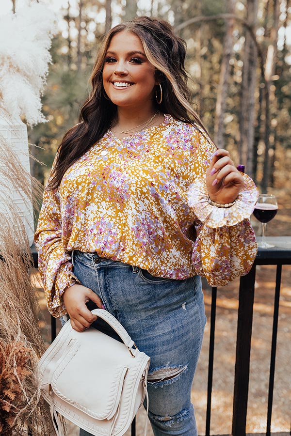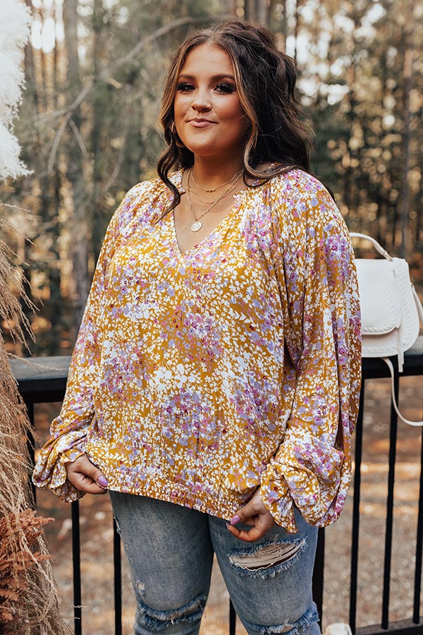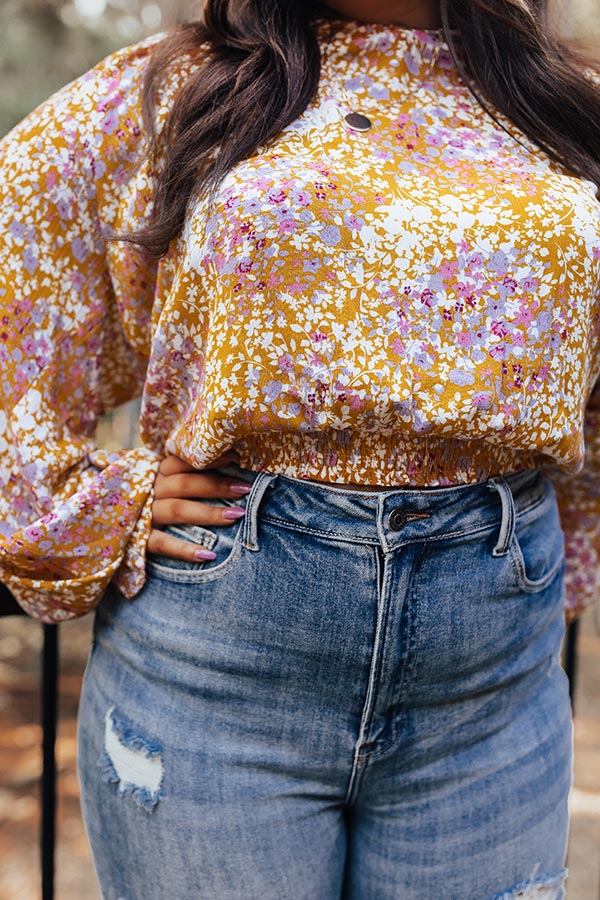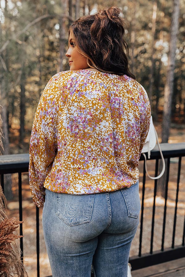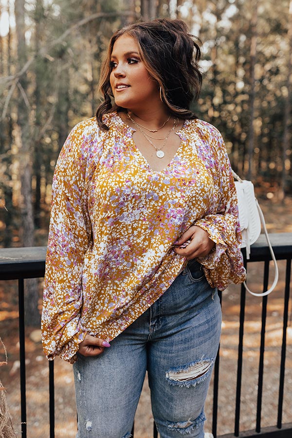 Welcome fall effortlessly in our charming plus size mustard colored 'Winette' top featuring lightweight material patterned with a small white, pink, and purple hued floral print, a v-cut neckline with a smocked back, long bishop sleeves with flared cuffs, and a relaxed silhouette that falls into a straight hemline!