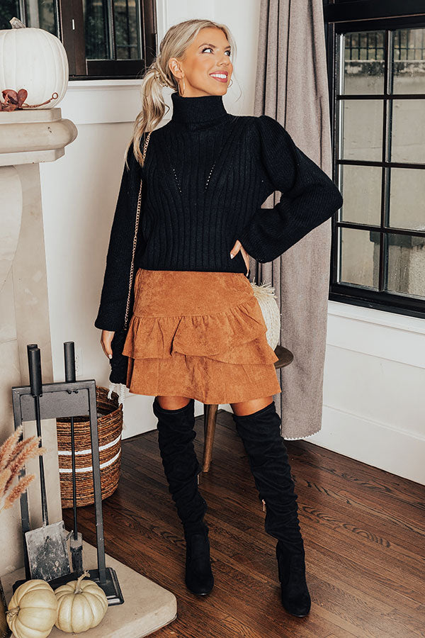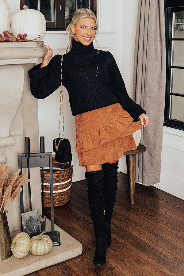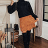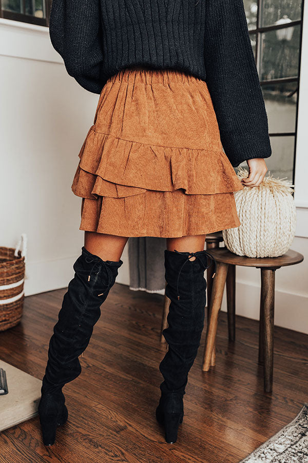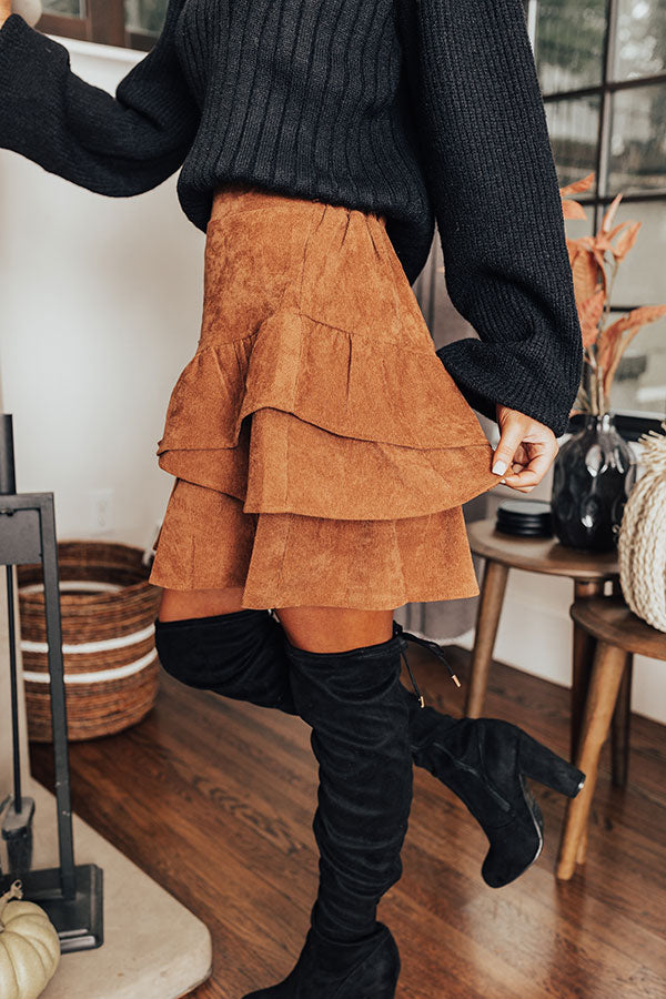 Twirl into the upcoming season like a true fashionista with our flattering camel colored 'Wynn' skirt featuring faux suede material, an elastic waistline, and a flirty ruffled silhouette that falls into an uneven mid-thigh length hemline! Measurements