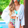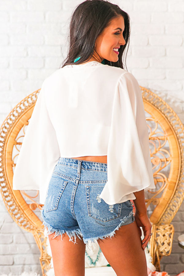 Don't let your wardrobe TIE you down… Instantly transform any look with the "Yacht Party Overlay." This cropped tie top has ultra flowy bell sleeves & a relaxed poly bodice that ties in the front. Style with your favorite high waisted denim & a cami for a concert in the park, or throw on over your favorite swimsuit & hit the pool in style… Your options are endless with this versatile tie top!