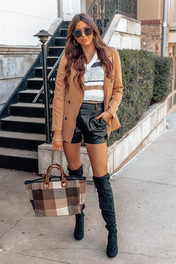 Make the street your runway in our chic black 'Yasmine' shorts featuring sleek faux leather material with pleated detailing, a high waistline with belt loops, accent side pockets, and a relaxed but flattering silhouette that ends in straight upper-thigh length hemlines!