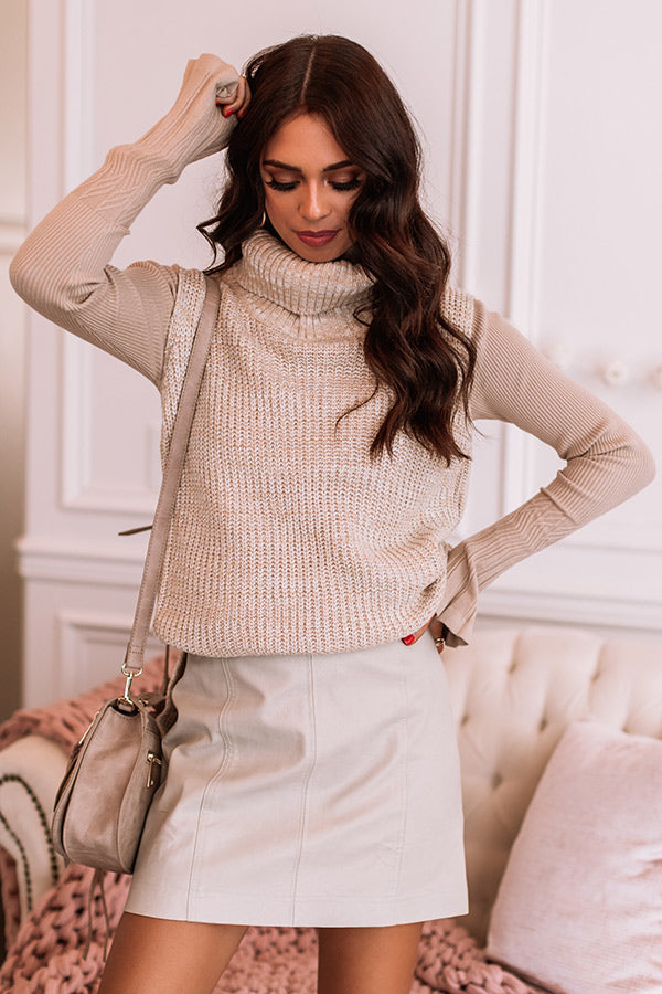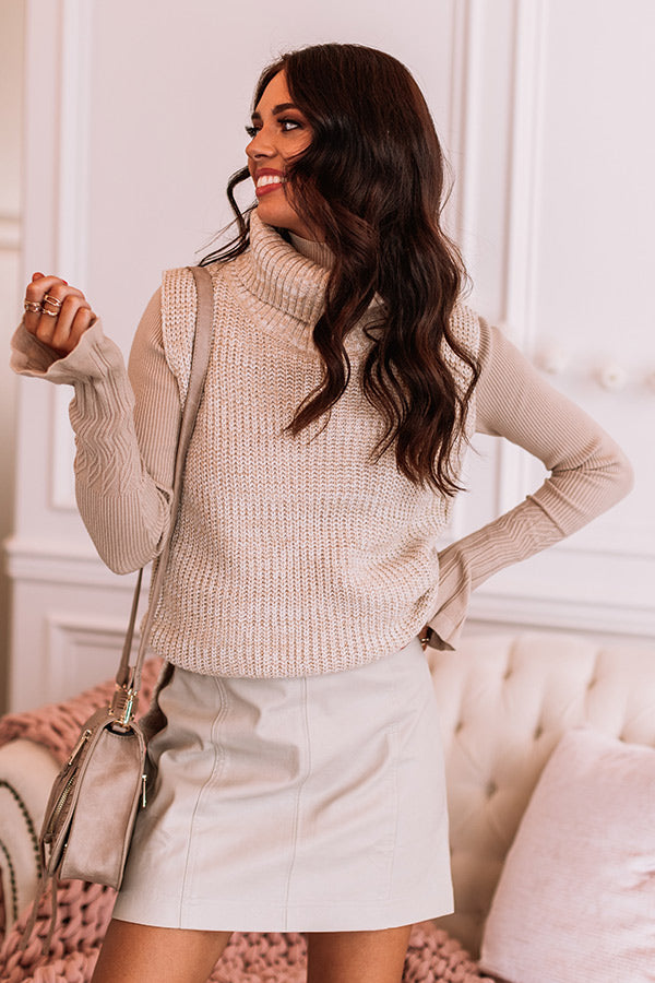 Upgrade your holiday style with our sophisticated iced latte colored 'There For You Sweater Top' featuring soft lightweight tight knit material with ribbed texturing, a turtle neckline, wide 4-inch sleeveless shoulders, and a flattering vest silhouette that ends in a straight hemline with accent side slits! Measurements