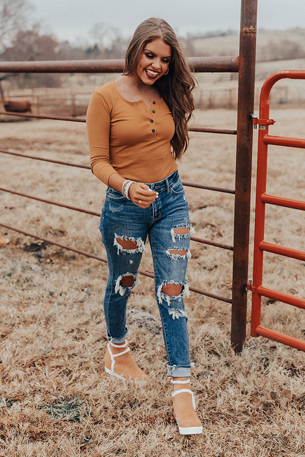 Everyone will undoubtedly be "thinking of you" when you wear this adorable camel colored bodysuit featuring soft lightweight material with ribbed texturing, a button up bodice with a scooped neckline, long sleeves, and a form fitting silhouette that falls into a cheeky fit with two button snaps! You can style this piece under any type of bottoms and wear any type of outerwear with it for a variety of looks that will carry you from season to season! Measurements