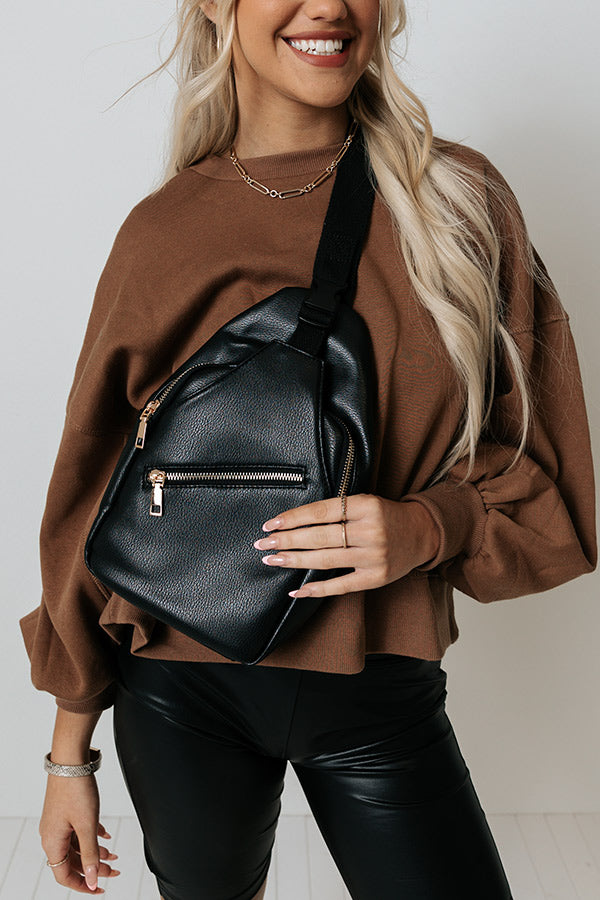 Perfect for everyday use, our casual black 'Thinking Out Loud' backpack featuring sleek faux leather material, a single adjustable crossbody strap, a diagonal zipper pouch in the front, and a spacious fully lined pouch with a zip closure!